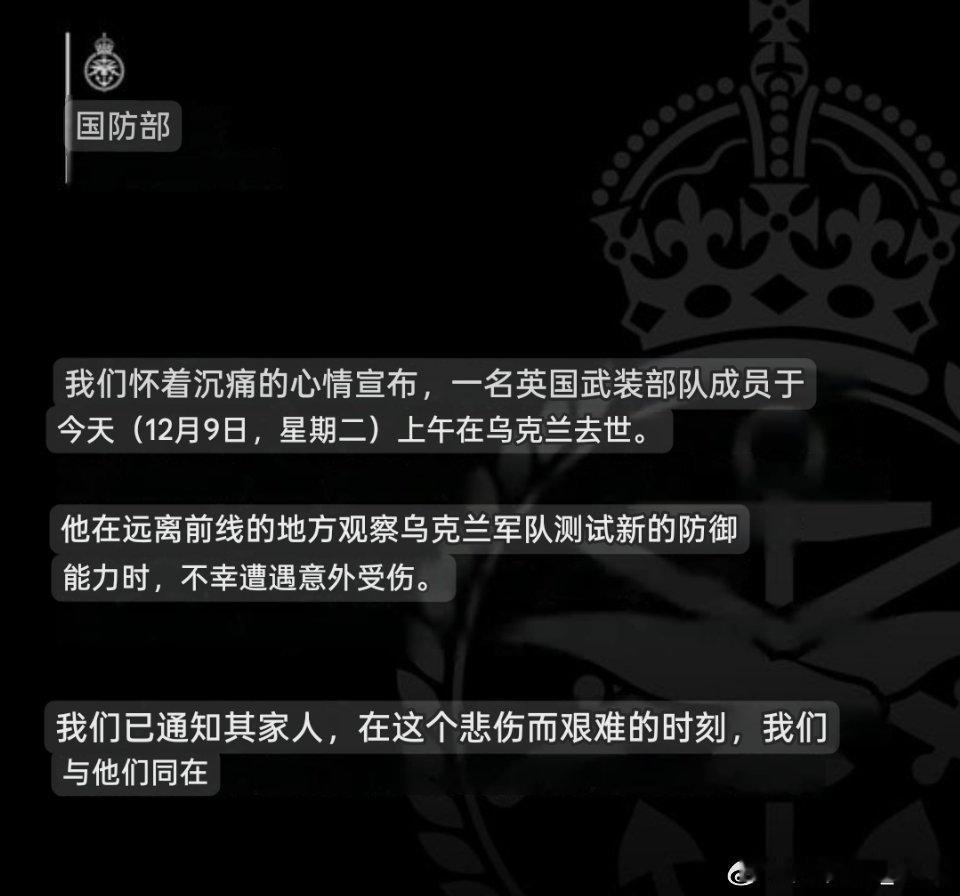 🚨一名英国军人在乌克兰死亡英国国防部声明称,一名英国武装部队成员“在远离前线的地方观察乌克兰军队测试新的防御能力时,不幸遭遇意外受伤。”