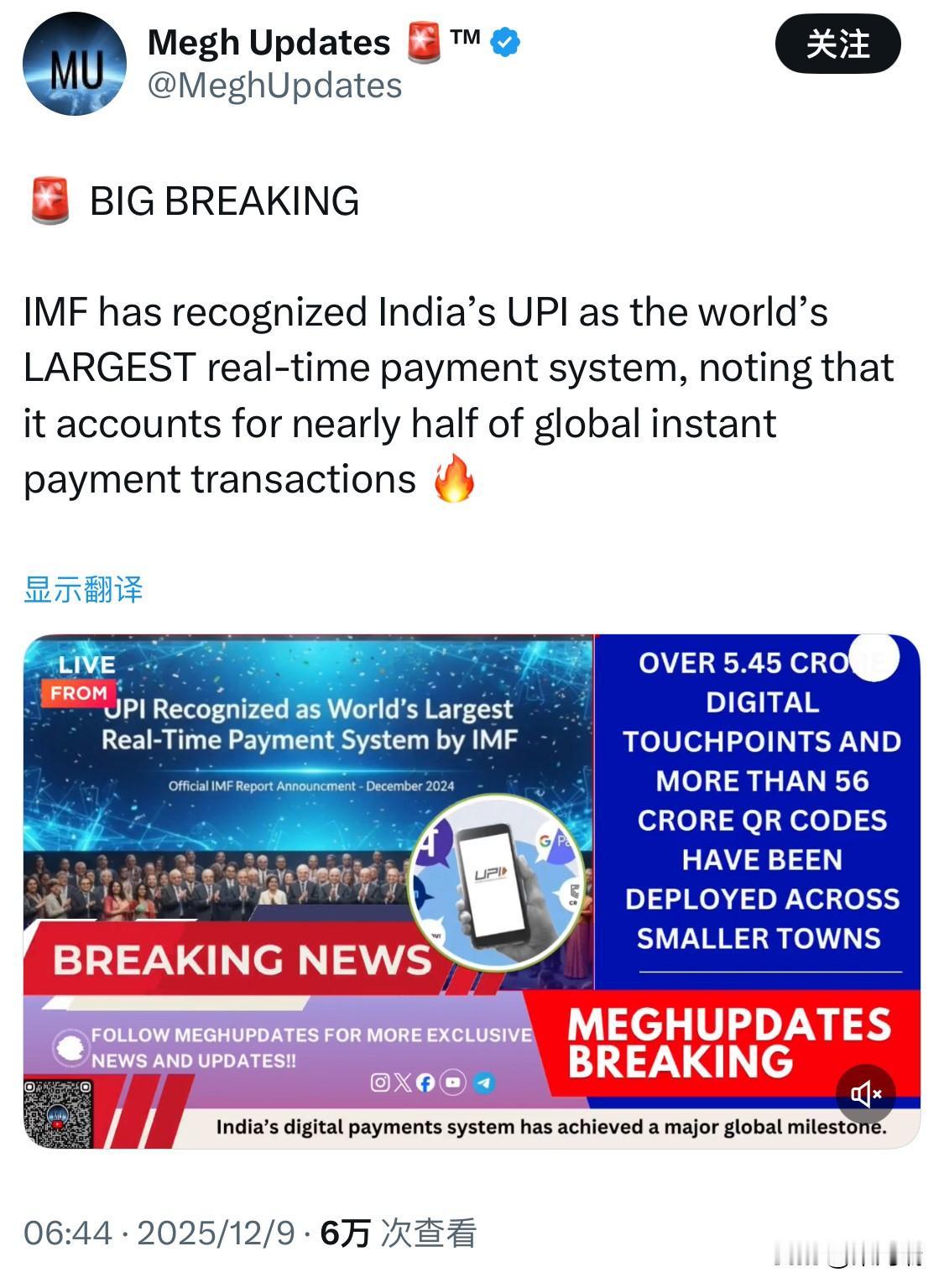 重大新闻:国际货币基金组织已认定印度的 UPI 为全球最大的实时支付系统,并指出其占全球即时支付交易的近一半。 IMF 在其 2025 年 6 月发布的题为《增长的零售数字支付:互操作性的价值》的报告中,正式认可了 UPI 的全球领先地位。 根据 ACI Worldwide 2024 年的一份行业报告,UPI 约占全球实时支付系统交易总量的 49%。 印度在 2023 年实现了 1293 亿笔交易量,超过了全球前十大实时支付市场交易量的总和。 在印度,实时支付占所有电子支付的 84%。UPI 已经成为印度人日常交易的默认支付方式,从街头小贩到大型企业都在使用。 印度政府、印度储备银行(RBI)和印度国家支付公司(NPCI)采取了多项措施来推广 UPI,包括部署超过 5.45 千万个数字接触点和超过 5.6 亿个二维码,特别是在中小城镇。 不过,国际货币基金组织也承认,印度的财务报表是不真实的,并被评为C级。