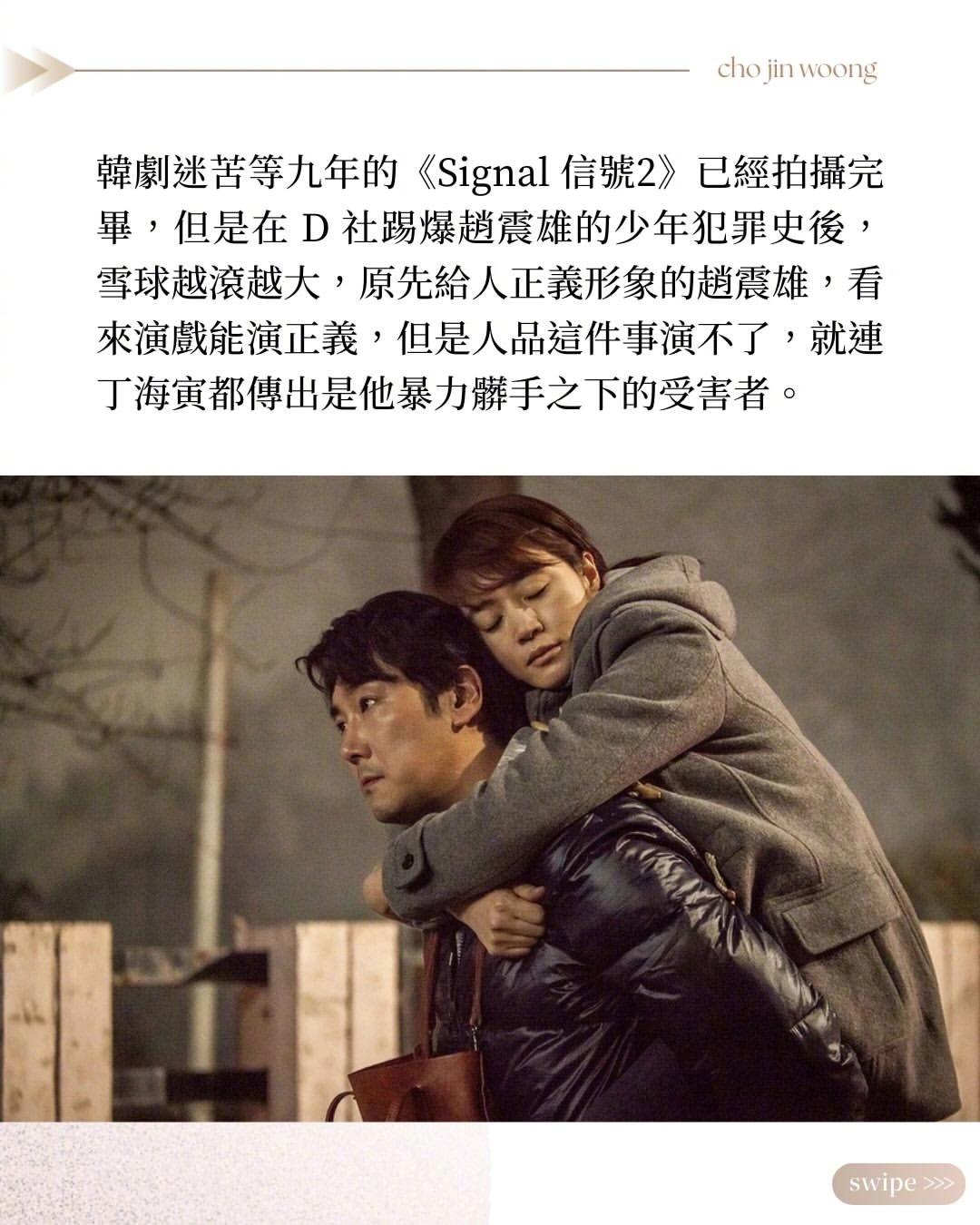 D社爆赵震雄曾殴打丁海寅,韩国娱乐圈这两天挺热闹的,在D社曝光赵震雄少年犯罪史后,事件持续发酵,其在娱乐圈的暴力史,逐一浮出水面。他被揭露多年前曾殴打丁海寅、掌掴《Moving》副导演。经常出演正义形象的赵震雄,真实人品其实坏的一塌糊涂。现在将要播出的《信号2》成了最大受害者!