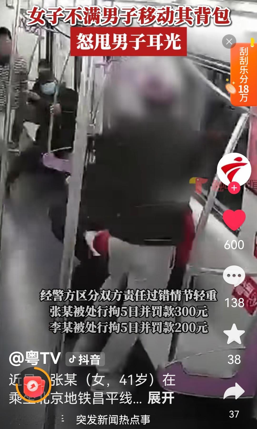 最近北京地铁昌平线上 一女子因不满男子移动她的包 怒甩男子耳光 我是女的 我也不站老仙女这边 人家不就是移了下你的包吗 结果她就甩人家一个大耳光 打人本就不对 还打脸 结果惹怒了男子 男子还手也打了女子 结果也被处罚了 两人均被拘留五天 罚款300.200 但是我觉得男的冤 人家只是正当防卫而已 难道就得被动挨打吗? 大家说是不是这个理?