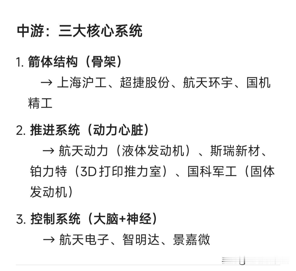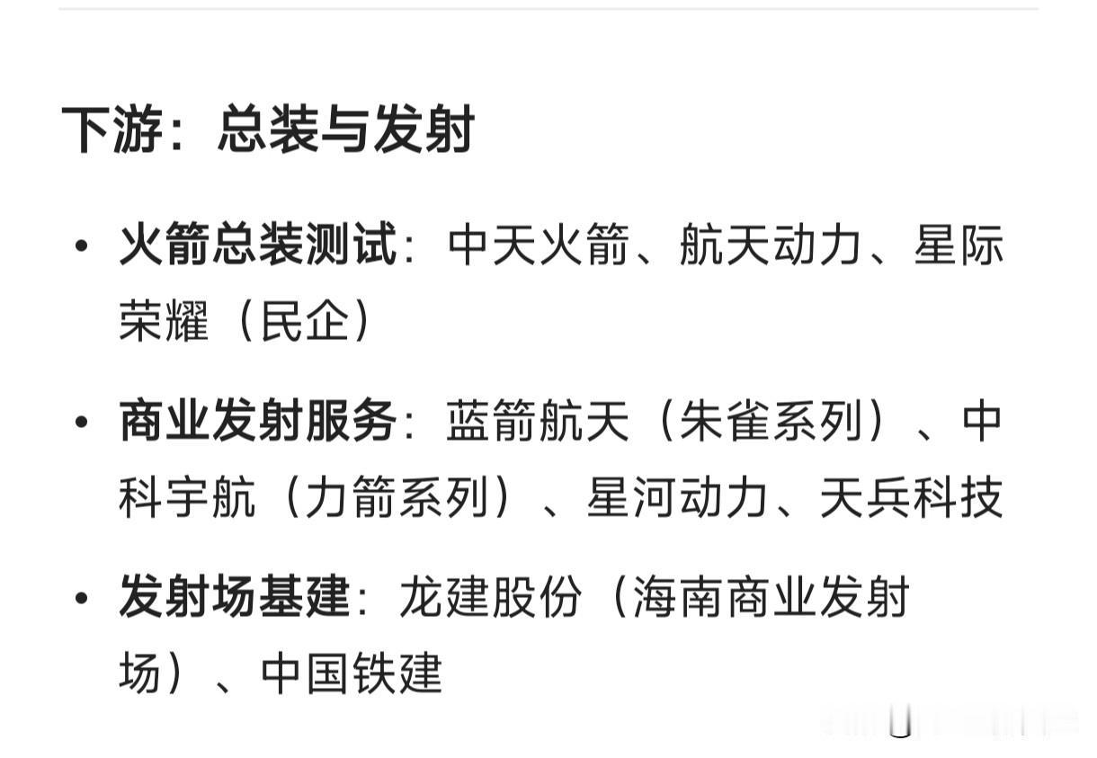 运载火箭产业链,细分龙头代表企业: 上游:基础支撑 钛合金材料:宝钛股份、西部超导 碳纤维复合材料:光威复材、菲利华 电子元器件:航天电器、高华科技、紫光国微、复旦微电   中游:三大核心系统 箭体结构(骨架)  → 上海沪工、超捷股份、航天环宇、国机精工 推进系统(动力心脏)  → 航天动力(液体发动机)、斯瑞新材、铂力特(3D打印推力室)、国科军工(固体发动机) 控制系统(大脑+神经)  → 航天电子、智明达、景嘉微   下游:总装与发射 火箭总装测试:中天火箭、航天动力、星际荣耀(民企) 商业发射服务:蓝箭航天(朱雀系列)、中科宇航(力箭系列)、星河动力、天兵科技 发射场基建:龙建股份(海南商业发射场)、中国铁建