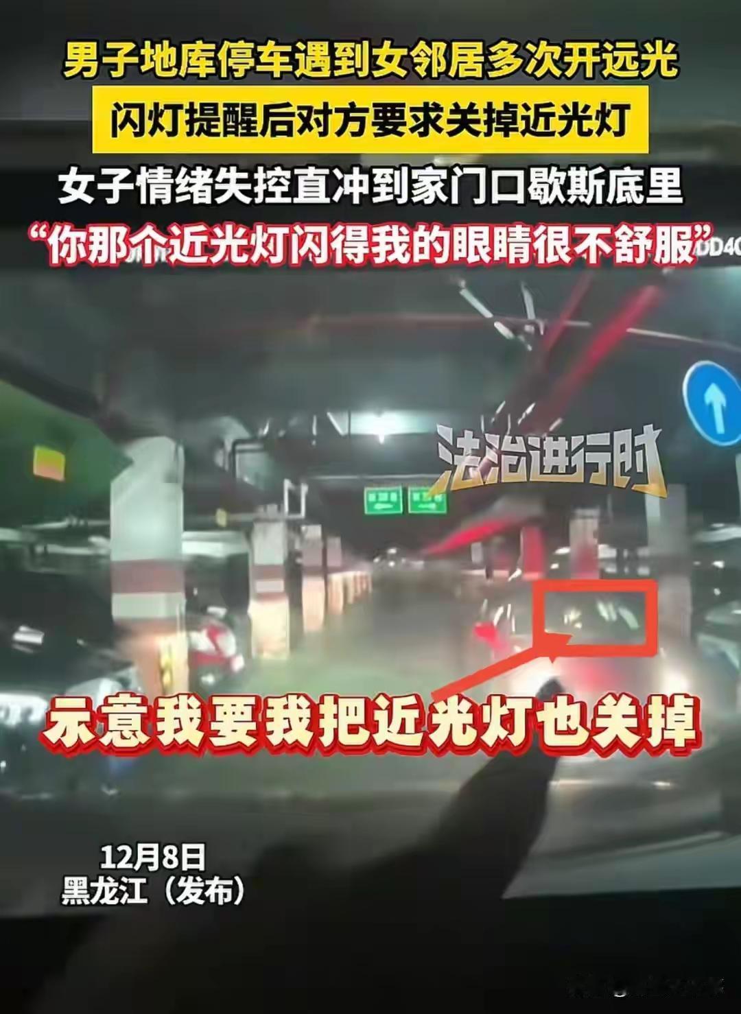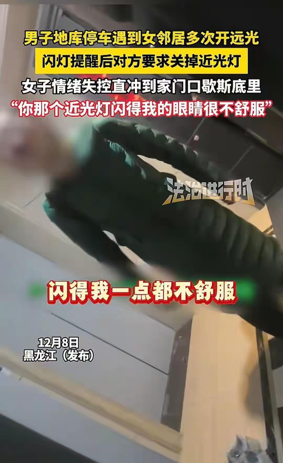 女邻居情绪失控了,在男邻居家门口大吼大叫!原因是车库停车的时候会车的灯光远近,俩人差一点打起来。 近日,黑龙江一男子遇到了一个糟心事。 他开车进车库的时候,刚好遇到回来的女邻居。 本来是好心好意,他发现对方开着远光灯,有些耀他眼。 于是他随手闪了一下灯,提醒女邻居把远光灯关了。 可是,女邻居不仅没有把远光灯关了,要求男邻居把自己的灯光关了,刺了她的眼睛。 男子关了灯光,可是女子还是开着远光灯。 当女子停好车后,直接上门找男子对峙。 女子说连说带比划,情绪失控到歇斯底里的大吼大叫起来。 原因就是这么一个原因。 本来,大家都知道是女子做的不正确,这停车会车,要开近光灯 ,这个事情大家都知道。 当女子把当天晚上的视频公开后,才发现,事情的事实,又让很多人同情女子。 原来,他们俩开的车型不一样。 女子是小轿车 ,男子是SUV。 男子开着近光灯,直接让坐在驾驶室的女子睁不开眼。 男子车的近光灯的位置很高。 这事实导致女子觉得自己很生气的委屈。 但是,男子全程没有说话,只有自己的妻子和女子论证。 东北女子本来语言就丰富,如果有人冤枉她,那更是要大吼大叫。 理解女子,也理解男子。 按道理说,女子做法是错误的,停车会车都要近光灯,远光灯会让对方看不起,有危险。 按事实说话,女子冤枉,男子的近光灯对她来说,就是远光灯,眼睛应该看不清前面。 但这难道说不让大家开SUV。 所以说,只能和稀泥,以和为贵。 老话说的好,远亲不如近邻,近邻不抵对门。 邻居之间的小摩擦,说说笑笑过去就好,事情说开了,没必要红鼻子红眼睛的吵架。 以和为贵,做好自己就好。 对于这个问题,朋友们咋看的?