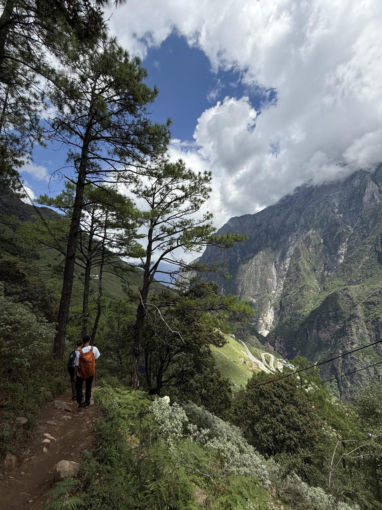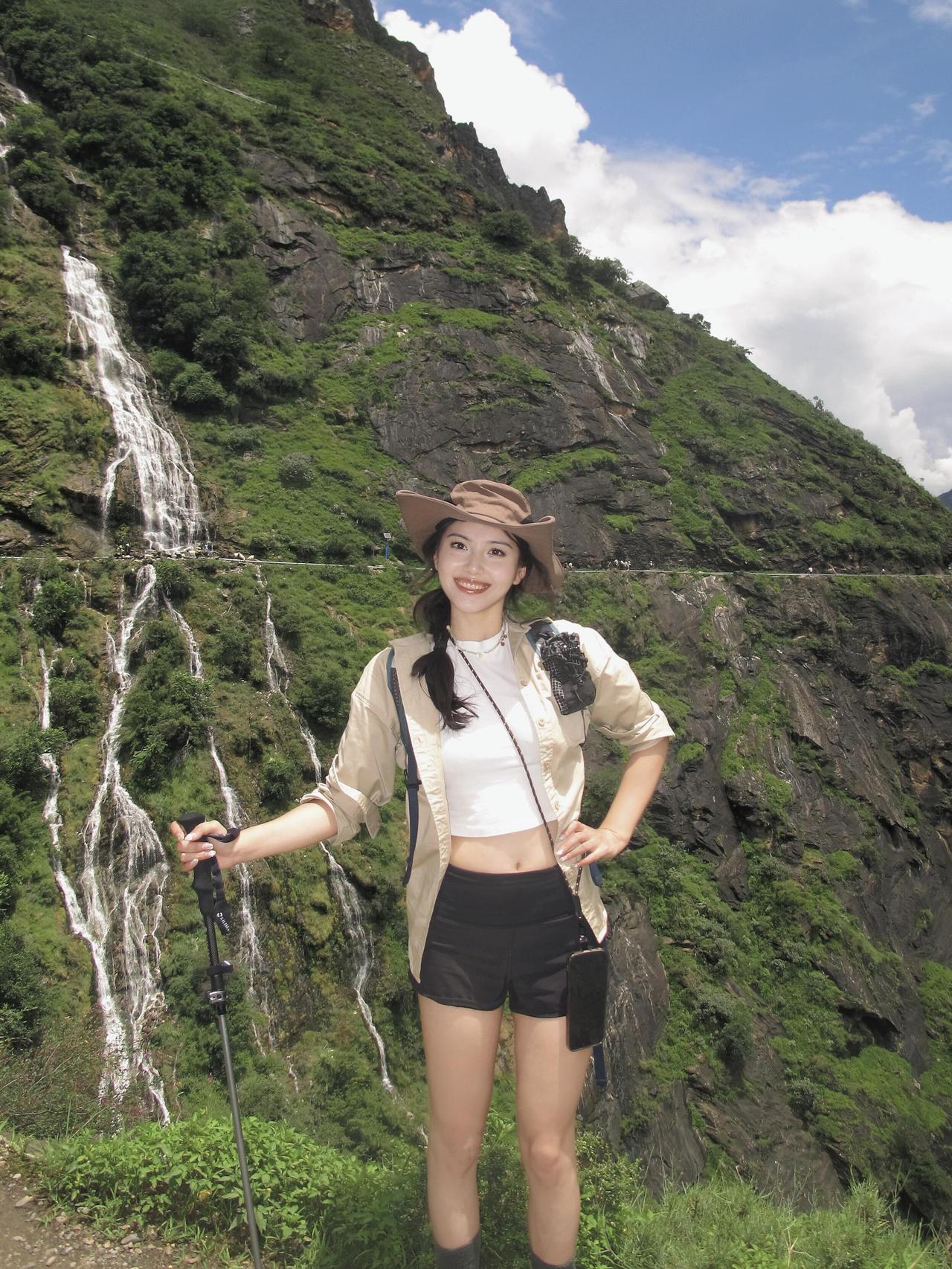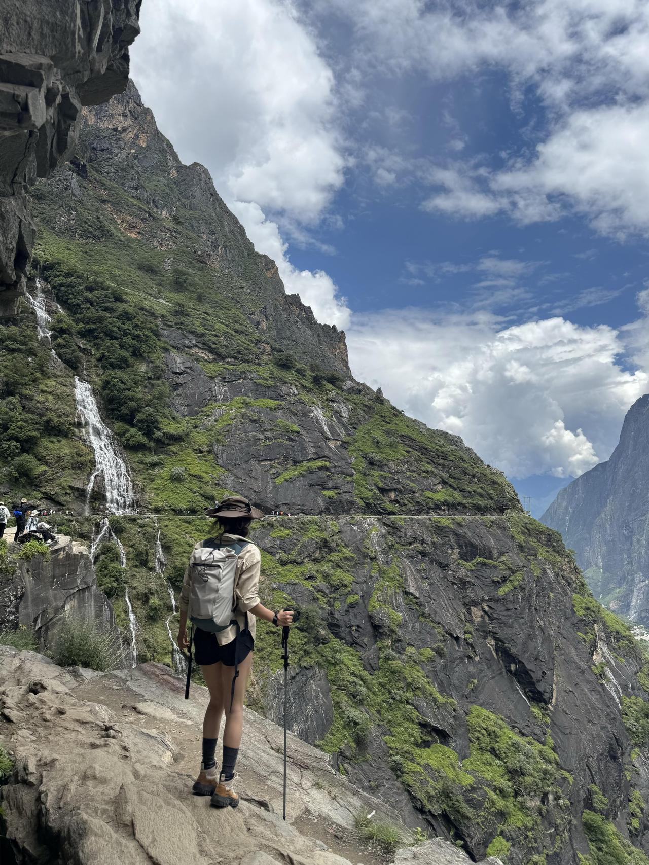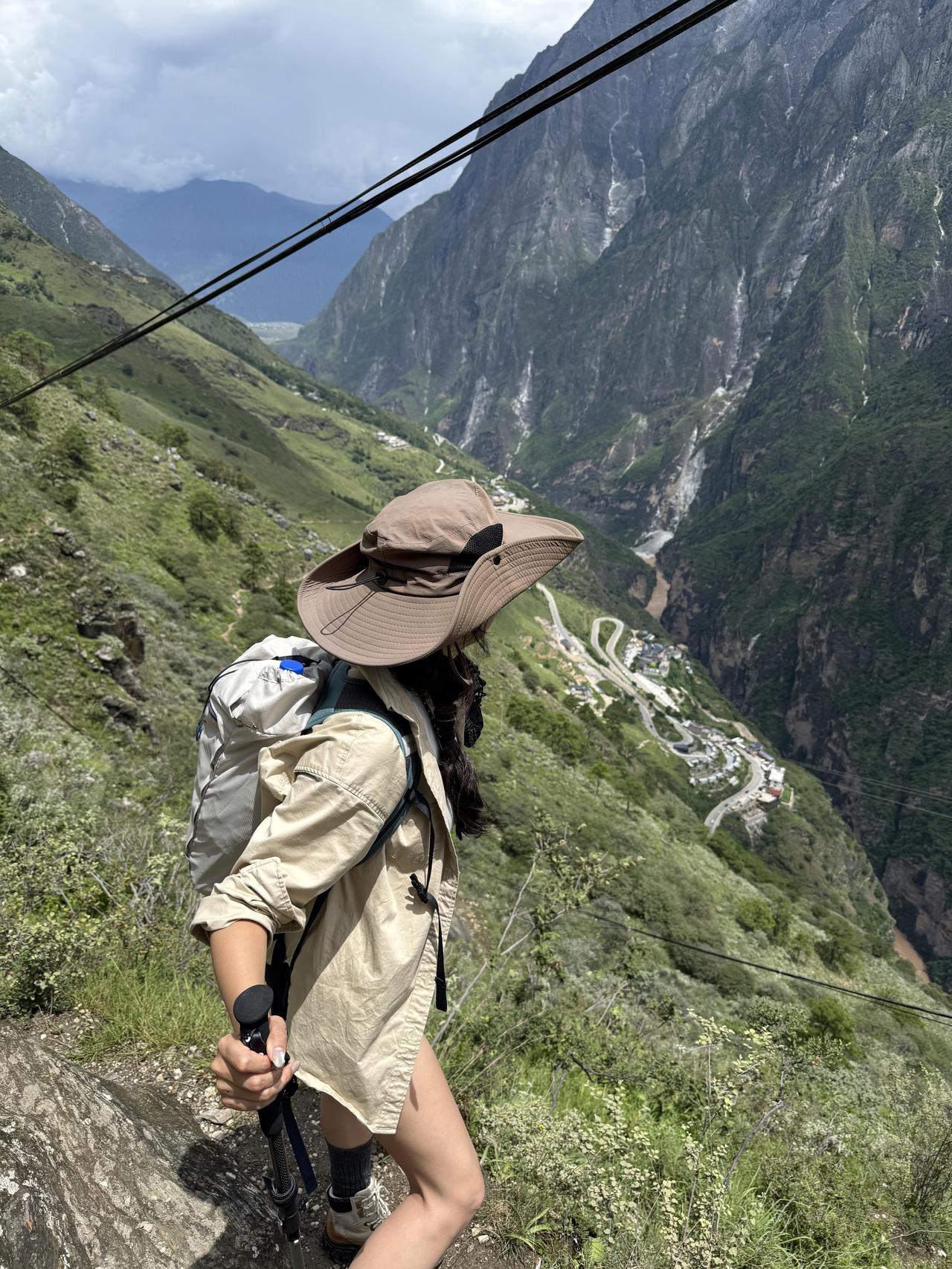 登山杖敲开虎跳峡的晨雾时 澜沧江的浪声,正撞碎峡谷的寂静 她走在蜿蜒的山径上,浅