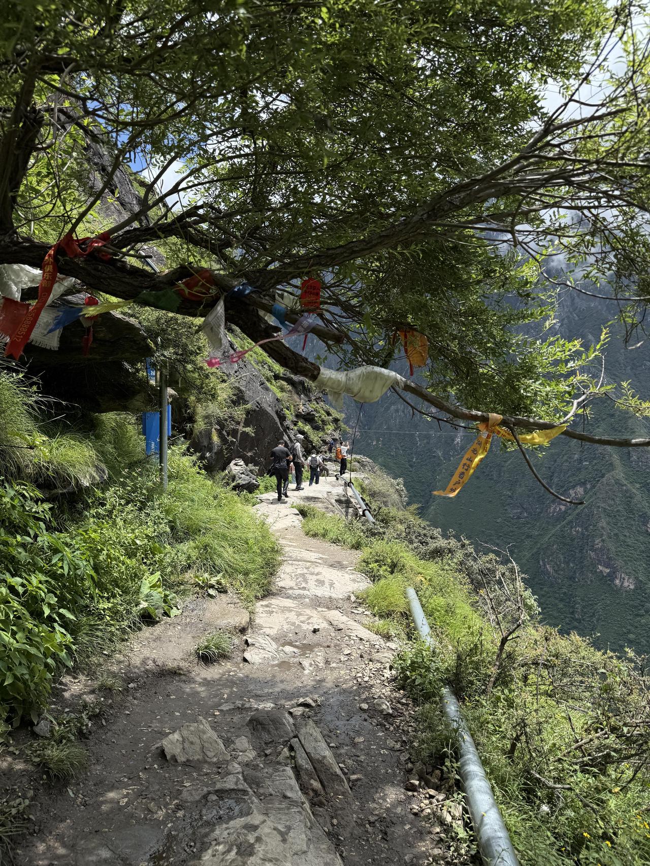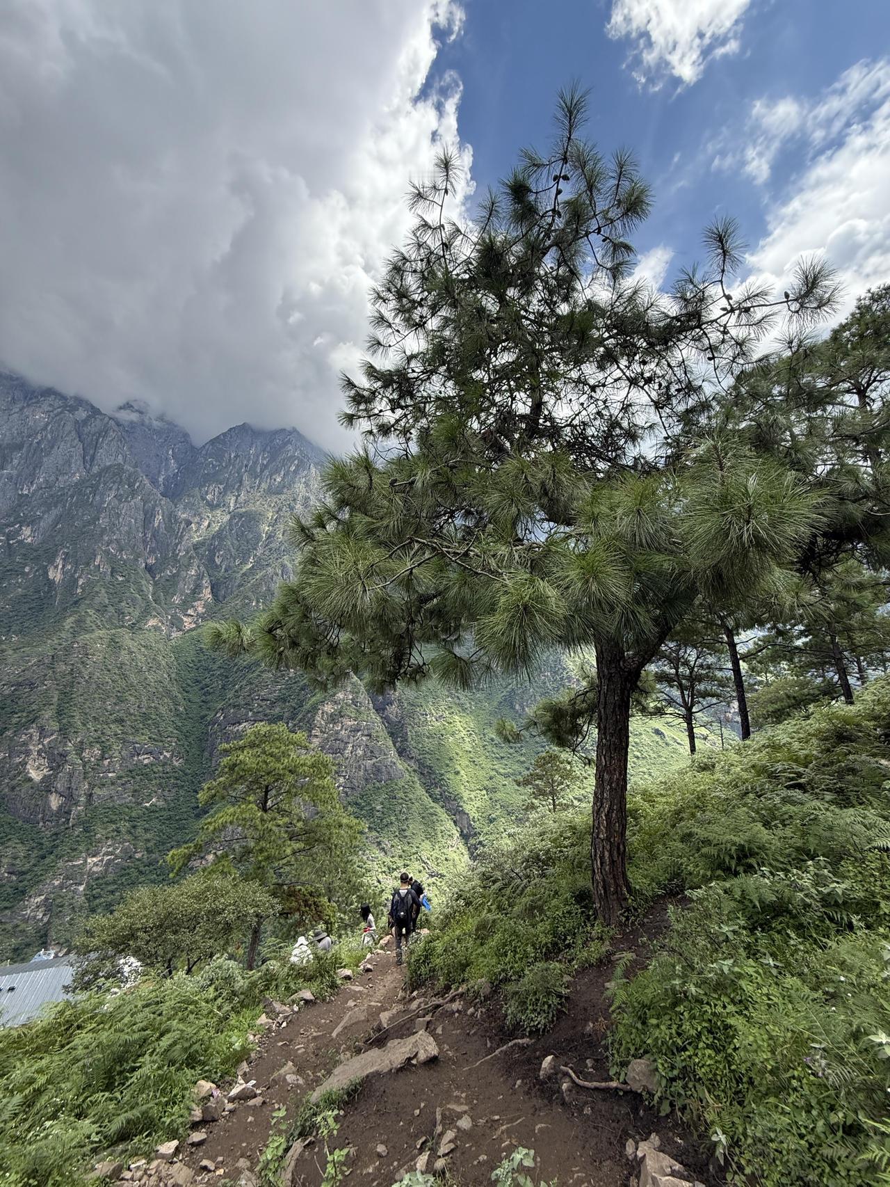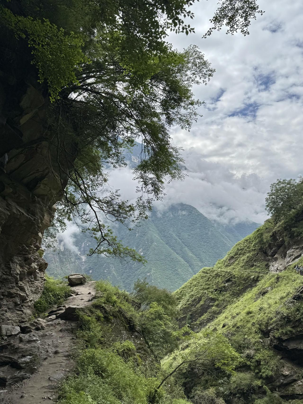 登山杖敲开虎跳峡的晨雾时 澜沧江的浪声,正撞碎峡谷的寂静 她走在蜿蜒的山径上,浅