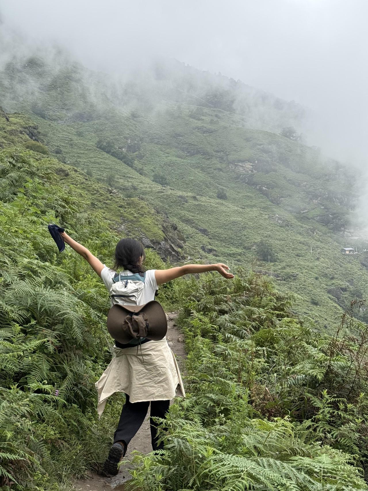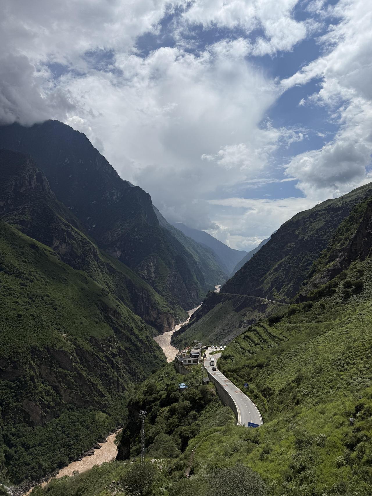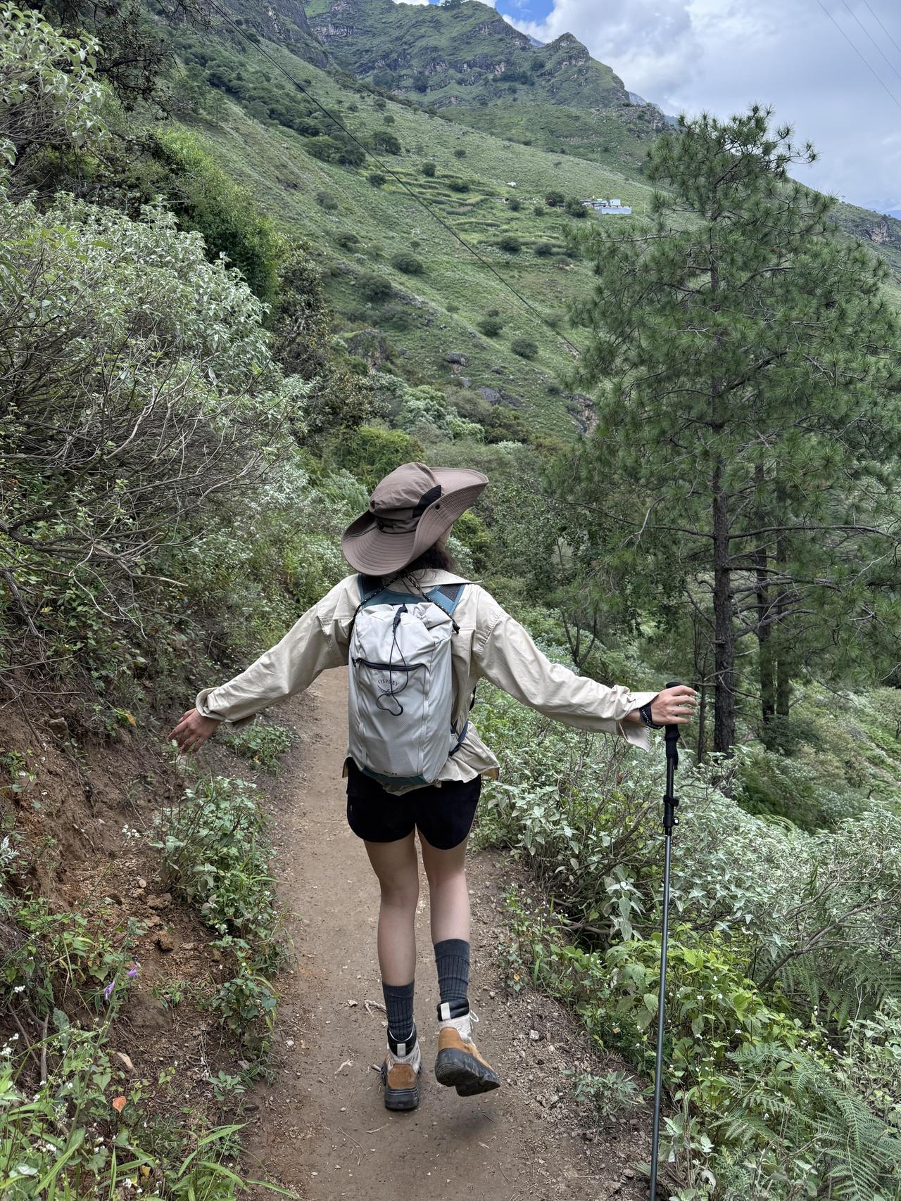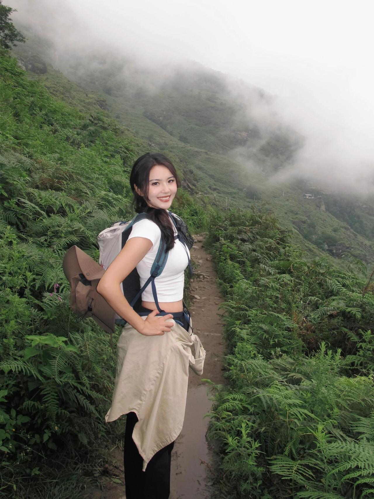 登山杖敲开虎跳峡的晨雾时 澜沧江的浪声,正撞碎峡谷的寂静 她走在蜿蜒的山径上,浅