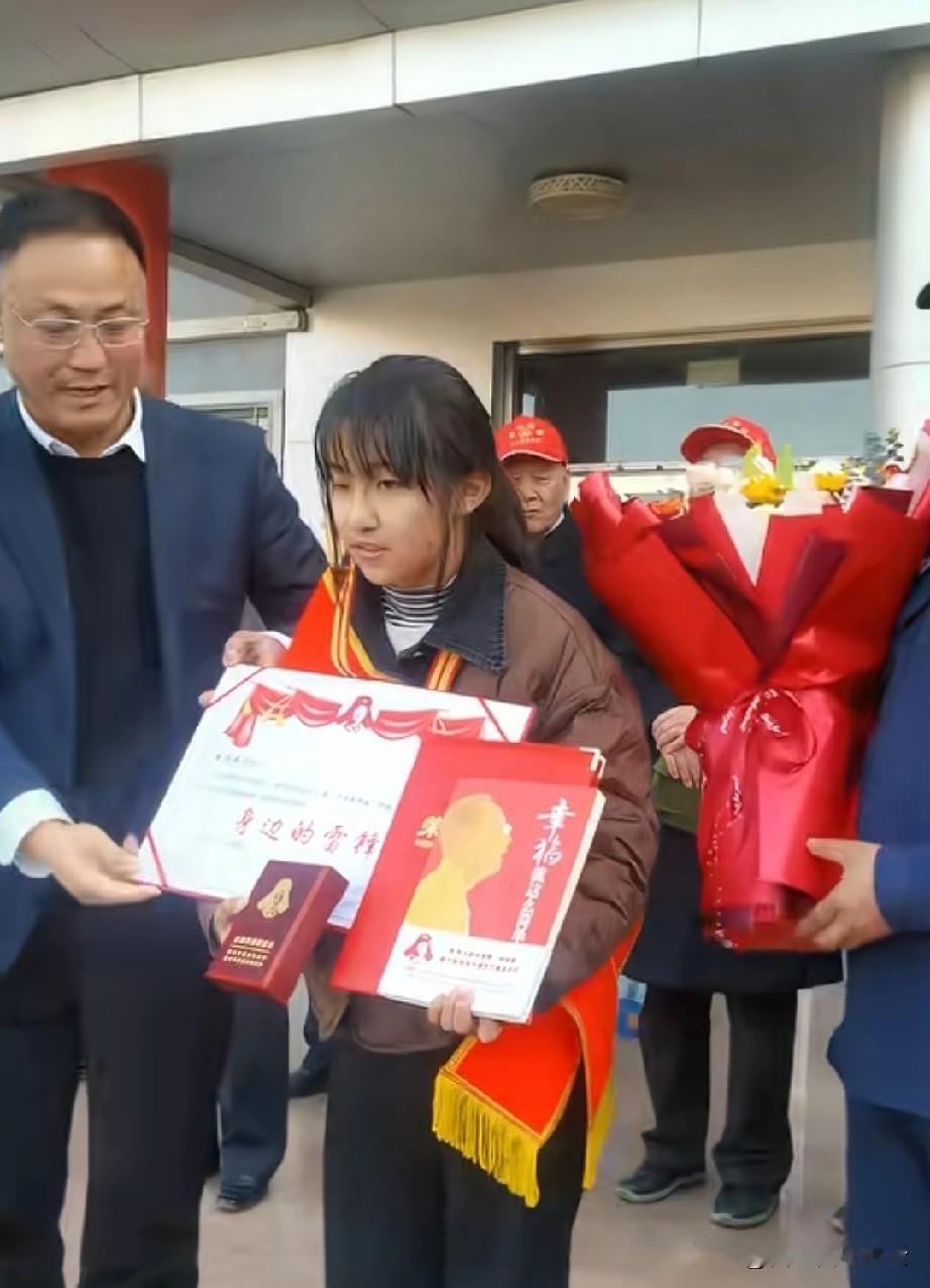 冰窟救人的13岁女孩李佳婷,最近又接受了社会各界人士的表彰,有给她送最流行的围巾花束的,有给她送书的,有给她送军用水壶的。这些大爷大妈看向女孩的眼神带着满满的宠溺,这么好的女孩谁不喜欢呢! 说实话,13岁能有这种胆识的女孩确实不多。不然人民日报都发视频点名表扬她,这是来自官方的宠爱。 有网友说,女孩的眼神很坚韧,像个古代的女侠。 也有网友说,这姑娘适合当兵,很有军人的气质。 我看这个女孩不管受到什么表彰,都从容淡定,不卑不亢的,还很有礼貌。就知道女孩被父母教育的很好。 我觉得,这样的好事,这样优秀的孩子,应该多报道,传递正能量。 对于这件事,你怎么看呢?