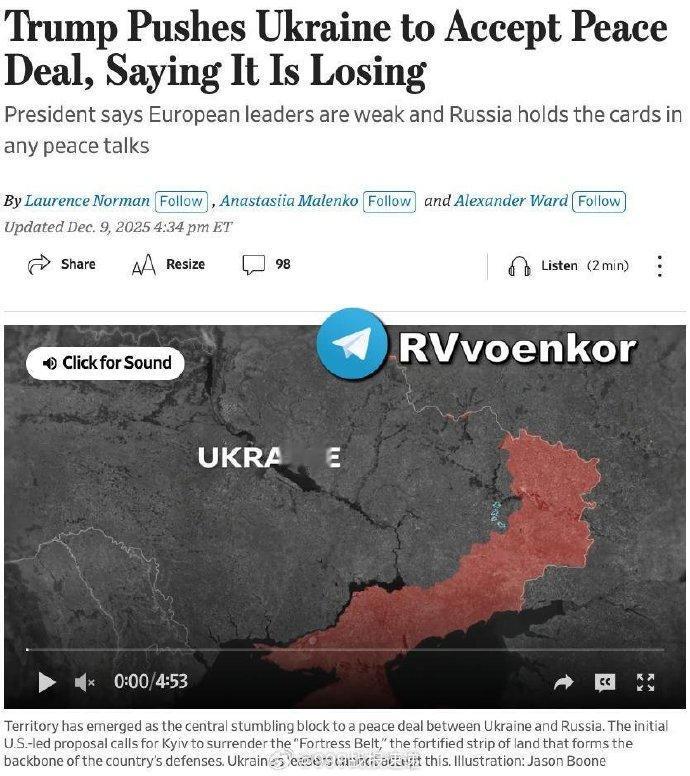 美国《华尔街日报》报道称,俄罗斯、美国和乌克兰可能需要很长时间才能解决和平计划关键条款的分歧。 欧洲官员表示,如果战场局势没有重大变化,各国可能需要"数周或数月"来讨论关键问题。 一位消息人士告诉该报:“我们知道美国人希望快速取得成果。但考虑到讨论问题的复杂性,很难想象我们能迅速达成协议。” 美国政府官员表示,他们不会迫使乌克兰签署一份“它不喜欢的协议”。
