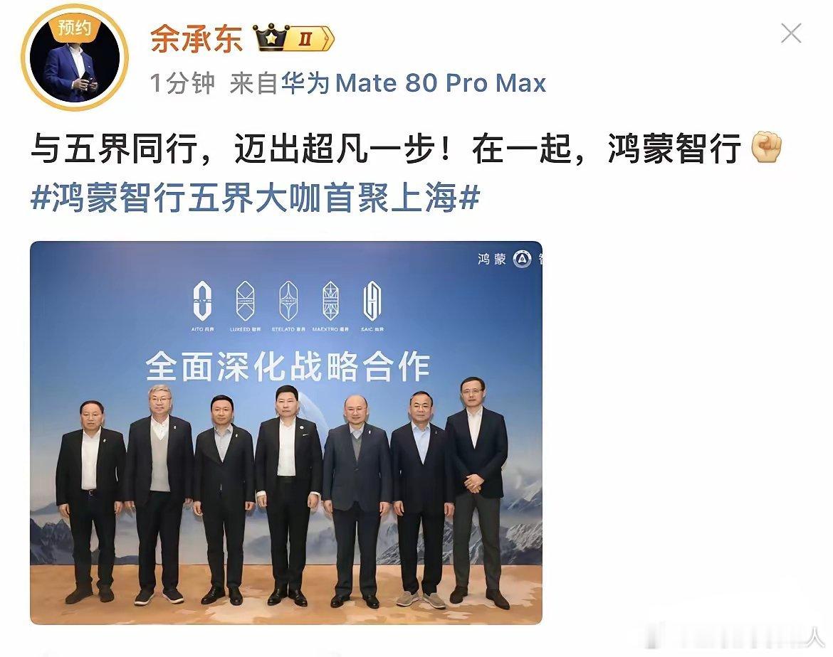 车圈最强男团齐聚上海了,这是现阶段车圈最厉害的几个人,当然最厉害的还得是C位这位个,妥妥的车圈顶流。他靠着一系列远见卓识和顽强拼搏的劲头,让华为不断创造历史,也让车圈跟着改写篇章,自己更是越来越强。他就是余承东,一个从农村出来,没背景没资源,凭着华为一步步翻身的普通人,如今带着华为在行业里打遍天下难逢对手。