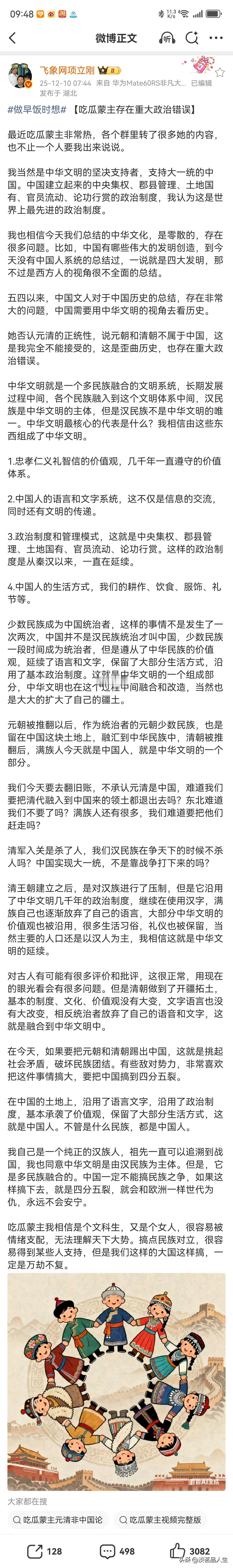 关于“吃瓜”,项立刚终于也站出来表达自己的观点了,他和老胡越来越像了。 项立刚对于吃瓜否定元清的的正统性,说元、清不属于中国,他认为是歪曲历史,是他完全不能接受的。 项立刚总结了他认为的中华文明的最核心代表:1..忠孝仁义礼智信的价值观,几千年一直遵守的价值体系。 2.中国人的语言和文字系统,这既是信息的交流,也是文明的传递。3.制度和模式,中央集权、郡县管理、土地国有、官员流动、论功行赏。这样的政治制度是从秦汉以来,一直在延续。4.最后就是中国人的生活方式,包括耕作、饮食、服饰、礼节等等。 虽然历史中有少数民族成为统治者,但他们遵从了中华民族的价值观,延续了语言和文字,保留大部分生活方式。而他们在漫长的统治过程中,也慢慢融入了中华文明之中。 最后,他认为只要在中国土地上,沿用了汉语言文字,沿用了基本制度,基本承袭了价值观,保留了大部分的生活方式,这就是中国人,不管是什么民族,都是中国人。 基本赞同项立刚的说法,何况建国70多年,从来没有过什么正统不正统之争,各民族都是一家人、中国人。最近这几年,关于这样的纷争越来越多,是不是有人刻意带节奏,成心扰乱我们的复兴事业,值得深思。