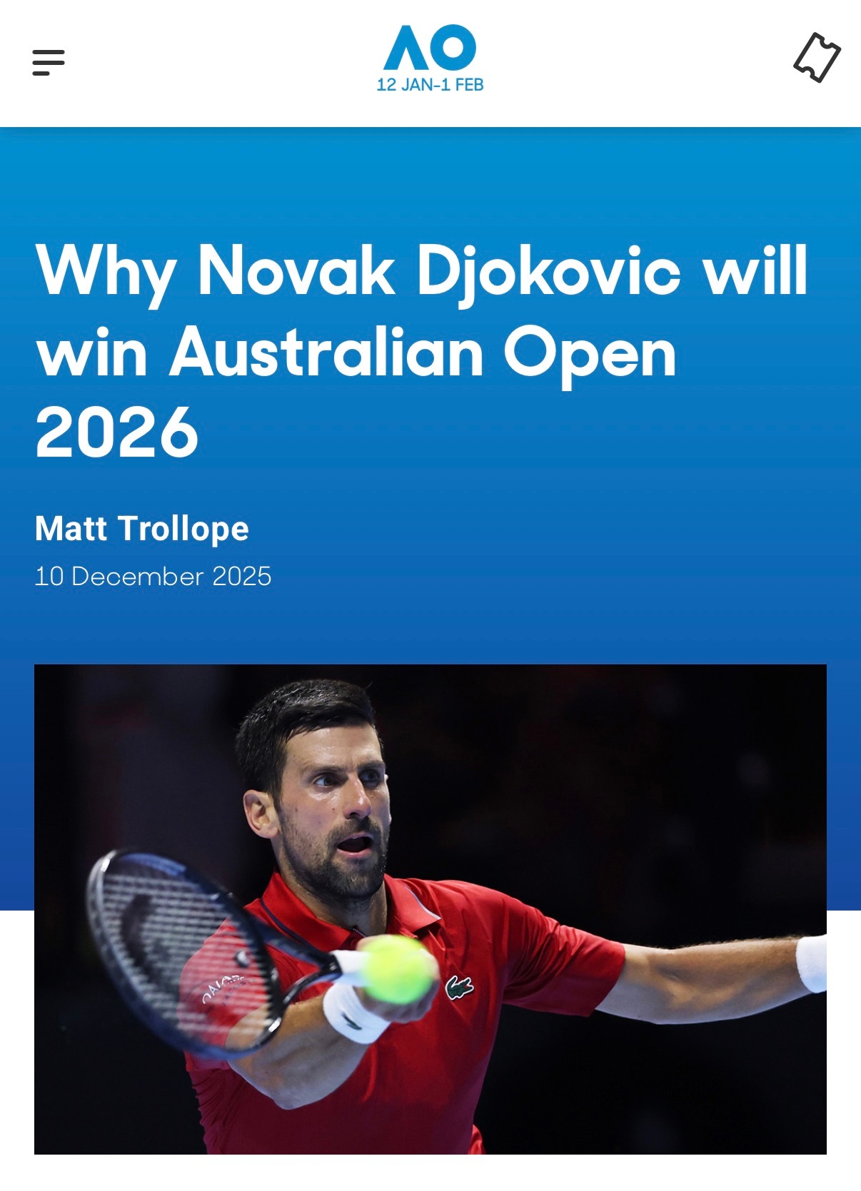 澳网官方发文奶赛会十冠王你鸡——《为什么德约科维奇会赢下2026澳网冠军🏆》正文⬇️若论墨尔本公园的成功之道,无人比诺瓦克·德约科维奇更了然于心。他手握十座澳网男单冠军奖杯——这是男子网坛的历史纪录,也是公开赛时代所有球员中的最高成就——其澳网胜率更是高达惊人的91%。若能在2026年澳网再添一胜,他将实现这项赛事百胜里程碑。如今这位塞尔维亚巨星几乎每次登场都在冲击令人敬畏的纪录。明年一月开启第二十一次澳网征程时,历史时刻将再度悬于一线:他有望追平玛格丽特·考特保持的11座澳网单打冠军历史纪录,并捧起创纪录的第25座大满贯单打奖杯。若成功加冕,他将以公开赛时代最年长大满贯单打冠军的身份,打破尘封半个多世纪的纪录。但他能在2026年澳网实现这一切吗?要回答这个问题,必须审视德约科维奇当前面临的两种现实境况。其一,他的竞技水平依然维持在高位——对于一位38岁且已在职业网坛征战二十余年的球员而言,这尤其令人惊叹。其二,世界排名前两位的卡洛斯·阿尔卡拉斯与扬尼克·辛纳正展现出更胜一筹的竞技状态,两人已包揽了过去八项大满贯冠军。德约科维奇本人也坦承,职业生涯现阶段与年轻对手抗衡的艰难。"2025年我四次大满贯中有三次止步四强,都是败给他们,这些年轻人实在太强了,"他在美网半决赛4-6/6-7(4)/2-6负于阿尔卡拉斯后表示,"前两盘我尚能积蓄能量跟上他的节奏,之后便体力枯竭,而他依然强势进攻。今年对阵辛纳时(法网与温网)也是同样感受。是的,五盘三胜制让我与他们交手异常艰难,尤其在大满贯赛事后期阶段。"对德约科维奇而言,这更多是体能问题而非技战术差距。尽管已属老将,他的体能储备鲜少显露疲态——除非网带对面站着的是辛纳或阿尔卡拉斯。今年三月,德约科维奇未失一盘闯入迈阿密公开赛决赛,达成大师赛60次决赛里程碑。法网之旅中,他直至四强战仅在对阵世界第三兹维列夫时丢失一盘。纵使温网与美网征程中遭遇更多波折,他也未曾被拖入五盘大战。其网球水准确实始终在线,2025年大部分时间里甚至堪称卓越。除达成公开赛时代最年长"全满贯四强"成就外,他还夺得两座ATP单打冠军,收获三场对阵世界前五的胜利,并以31战27胜的成绩迈向2026澳网。年末收官战中,他更在雅典决赛历经三小时鏖战力克时任世界第九洛伦佐·穆塞蒂,取得赛季第四场对阵世界前十的胜利。"您仍在证明,即便在这个年纪,依然能像今天这样教训我们,"穆塞蒂赛后坦言,"每次与您交手,我都视之为珍贵一课。"这进一步印证:即便身处"辛纳阿卡时代",德约科维奇依然具备在2026年澳网争冠的竞技水准、战绩底蕴与冲击势头。虽然已连续五次负于辛纳,德约科维奇对阵阿尔卡拉斯的战绩更具优势——双方最近六次交手他取得四胜。其中最荡气回肠的,当属2025年澳网四分之一决赛那场四盘鏖战。尽管那场比赛的消耗导致他在半决赛对阵兹维列夫时伤退,却再次彰显了德约科维奇在重大舞台上创造奇迹的能力。同样不可忽视的是:辛纳与阿尔卡拉斯不可能永远垄断大满贯。正如公开赛时代最伟大的男子网坛双雄——罗杰·费德勒与拉斐尔·纳达尔——的统治终有尽头,新一代王者连冠的脚步也必将停歇。费德勒与纳达尔在巅峰时期曾联手实现从2005年法网到2007年美网的11连贯伟业。而终结这一传奇纪录的,正是2008年澳网夺冠的德约科维奇。"我从未放弃对大满贯的追求,我将继续奋斗,至少再闯决赛,为下一座奖杯而战。但这会是极其艰巨的任务。(在五盘三胜制的赛事中迎战辛纳与阿尔卡拉斯)""我依然享受竞赛的颤栗感。(美网对阵阿尔卡拉斯时)我再次感受到全场观众山呼海啸般的支持,这让我无比沉醉。""而这,正是我继续前行的最大动力。"热点解读