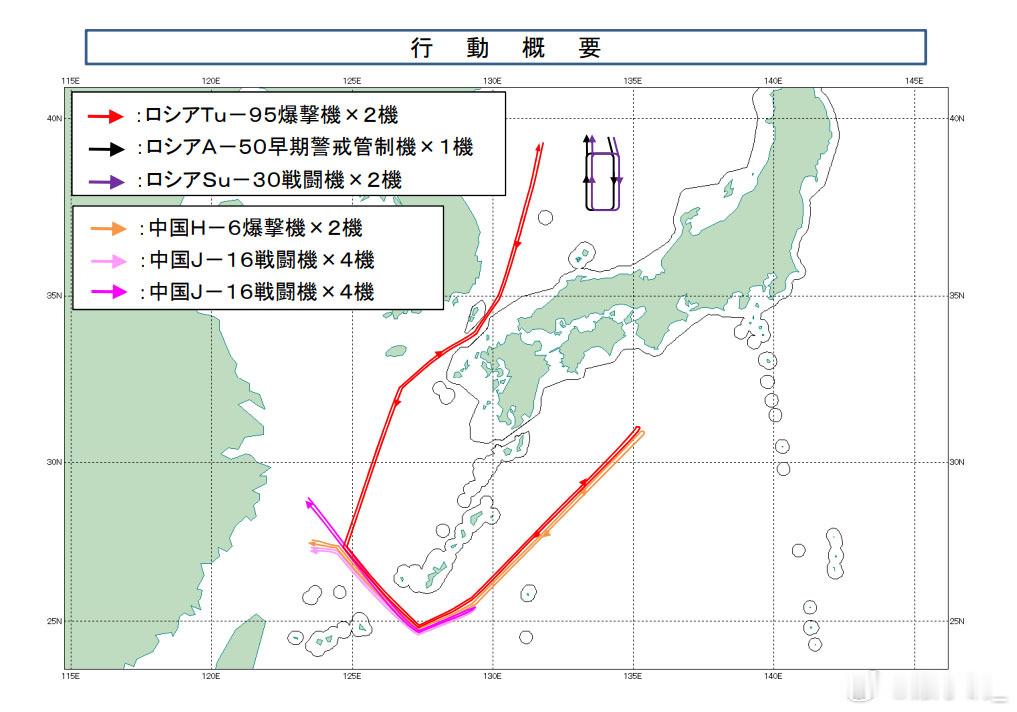 日本统幕监公布了中俄联合空中巡航的航迹图和图像。俄军2架图-95从日本海飞到东海后,与中方2架轰-6K会合,编队经宫古海峡飞到太平洋,再沿琉球群岛东南侧向东北方向飞行,最北飞到北纬31度线,非常接近日本本土。出宫古海峡时以及返回时均有4架中方歼-16战斗机护航。从航迹图看,中方飞机并没有接近韩国,与韩国的公布有出入。中俄两军组织实施联合空中战略巡航