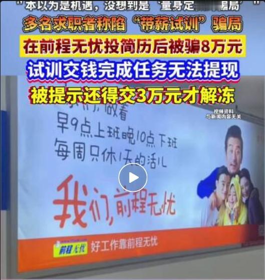 前程无忧平台惊现 “带薪试训” 骗局,多名求职者投递简历后被骗数万元,诈骗套路隐蔽且极具迷惑性。 骗局始于一条 “精准匹配” 的 offer 短信,骗子能准确报出求职者姓名和应聘岗位,让不少人放下戒心。回复短信后,求职者会收到伪造的正规 PDF 招聘文件,冒用速腾聚创、屹唐股份等上市公司名义,明确标注 “两天线上带薪试训,收入 300 元以上”。 第一步,骗子先抛 “甜头”:引导下载陌生企业版 App,首日任务是汇总高铁信息等简单工作,完成后立即发放 100-150 元返利,彻底打消信任顾虑。 第二步,次日任务突然升级,以 “数据测试”“公益捐款” 为由,诱导求职者在陌生平台投入资金,从几百元逐步加码到数万元。 第三步,待求职者想要提现时,骗子以 “操作失误”“账户冻结” 为由,要求缴纳 3 万 - 10 万元解冻费,群内 “同事托儿” 还会晒到账截图诱骗,甚至要求将现金放在共享电动车筐等隐蔽地点交易。 受害者质疑简历信息被泄露,前程无忧回应称已升级风控和企业资质审核,不排除不法企业套取信息,强调求职者需通过平台内沟通。 警方和律师提醒:正规招聘绝不会要求入职前投入资金,凡是让下载陌生 App、线下转账、缴纳 “解冻费” 的都是诈骗。求职时要核实用工单位资质,拒绝脱离平台的私下沟通,留存相关凭证,被骗后立即报警。