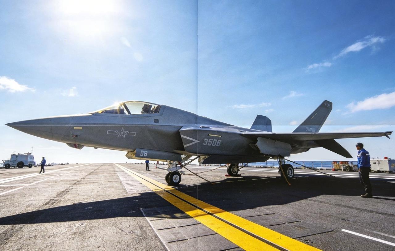 歼三五的3506号机停放在福建号航母上,在大海上灿烂的阳光下,歼三五的机身表面蒙皮的涂层,看上去银光闪闪的,会有一种银白色复古涂装的感觉,有点像二代机全身银色铝合金原色的味道。其实在正常视角下,歼三五的涂料是淡灰色的,带一点铁灰色,整体式比较暗淡的。