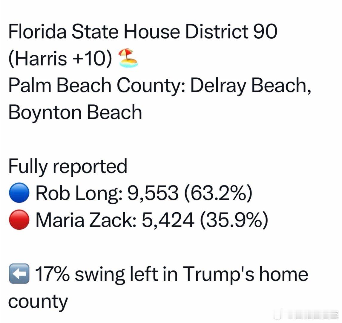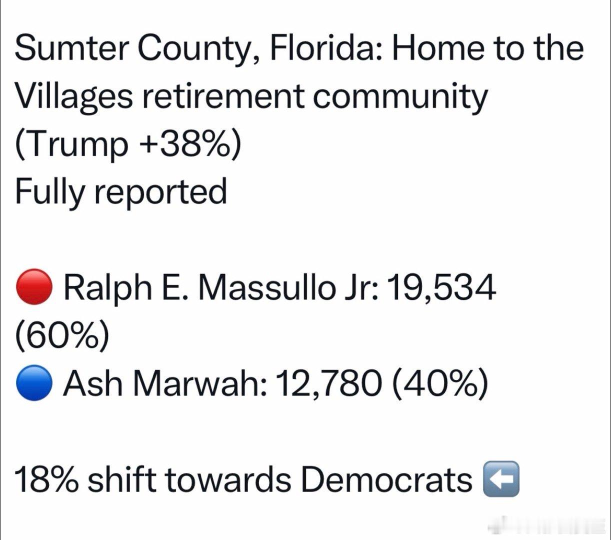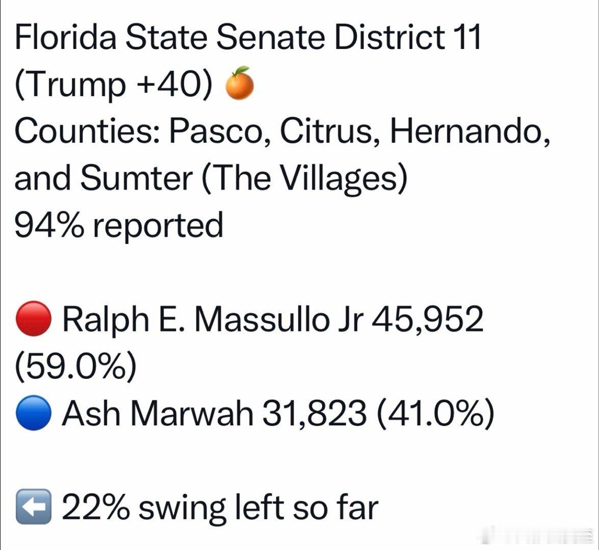 佛罗里达今天的选举,民主党形势大好与一年前相比,左转17-22个百分点⬅️