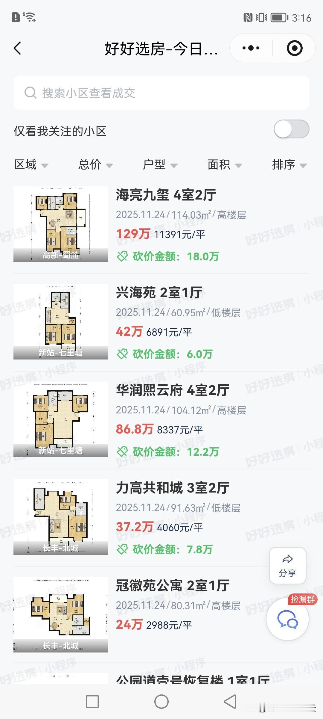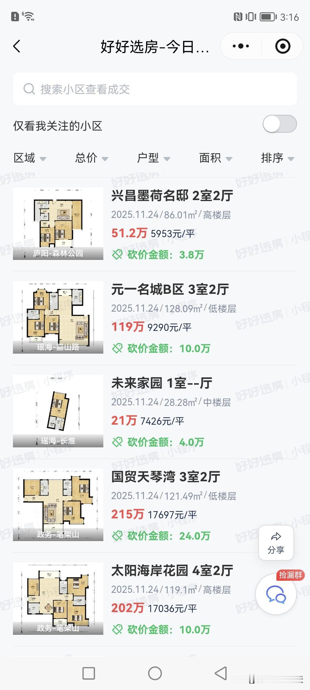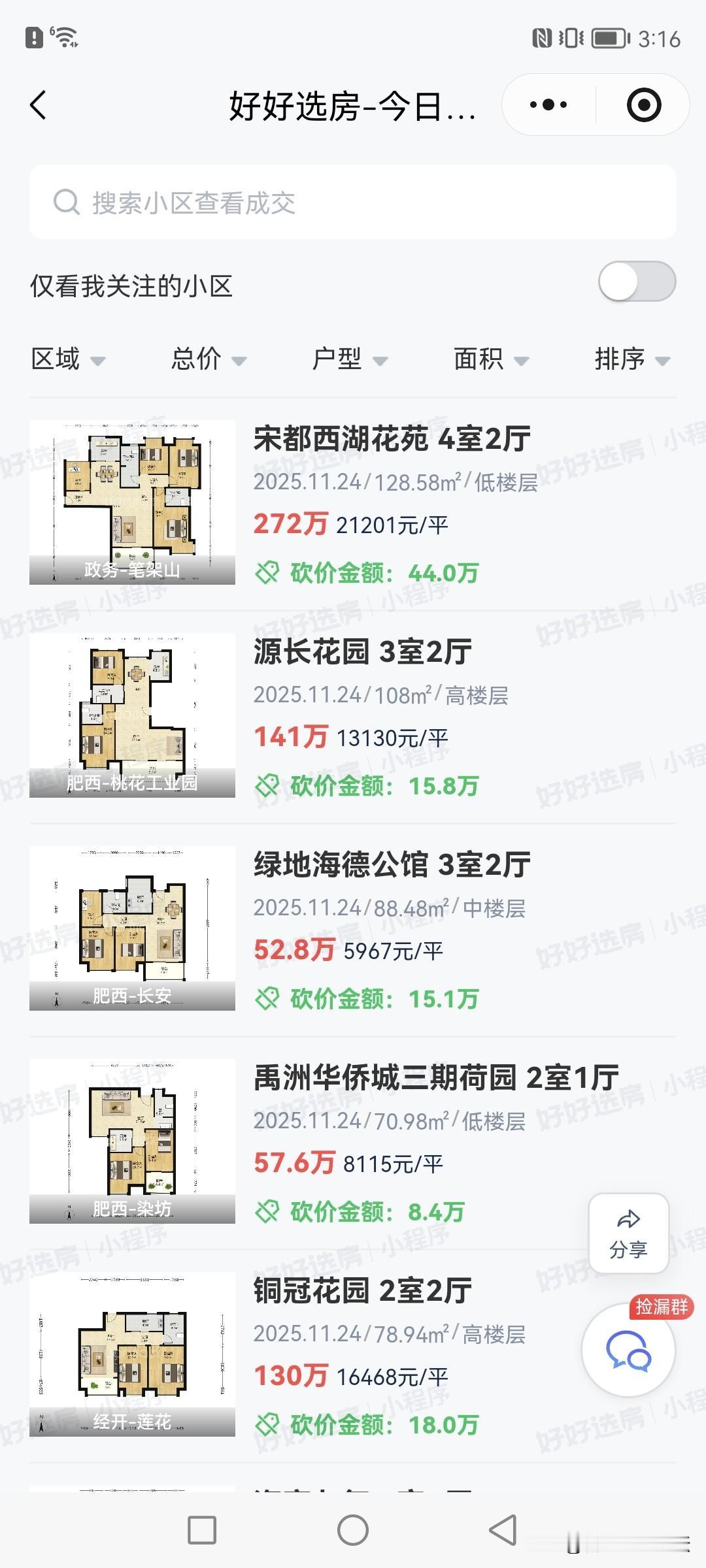合肥最新一天二手房成交情况。可惜的是现在凑不齐九宫格了。价格基本趋于稳定。除了远郊和大高层还有空间,其他的比较稳了。