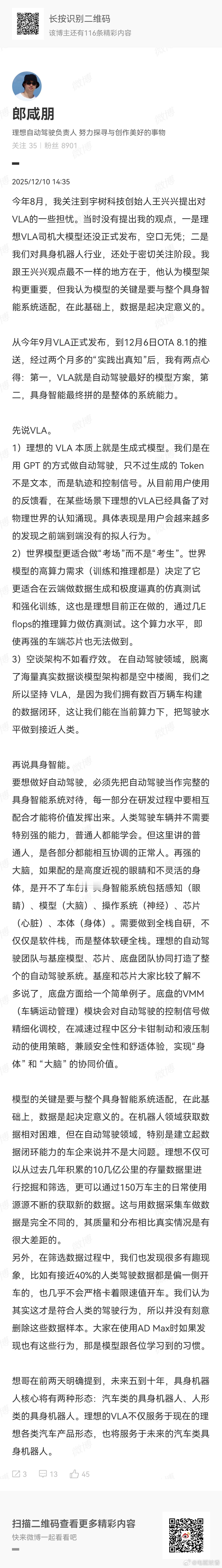 刚刚写了一篇长文,给大家总结一下,方便大家快速了解:郎博认为,在自动驾驶乃至更广义的具身智能领域,模型架构并非决定性因素,关键在于模型必须与完整的具身智能系统深度适配,而在此基础之上,数据才是最终起决定作用的力量。以理想汽车的VLA(视觉语言动作)模型实践为例论证:第一,VLA作为生成式模型,已通过真实数据验证其有效性,能在某些场景下产生对物理世界的“认知涌现”,输出更拟人的驾驶行为;第二,脱离海量真实数据空谈模型架构(如世界模型)是空中楼阁,理想凭借数百万车辆构建的数据闭环,才能将驾驶水平逼近人类。进而,将自动驾驶视为一个完整的具身智能系统,强调其成功依赖于感知、模型、操作系统、芯片、本体(如底盘)等全栈能力的协同自研与优化。只有“大脑”(模型)与“身体”(硬件执行机构)紧密配合,才能发挥整体价值。最后,在自动驾驶领域,建立数据闭环的车企拥有无可比拟的数据优势——不仅能挖掘存量数据,更能通过大规模用户车队持续获取真实、自然的驾驶数据(包括人类的不完美驾驶习惯),从而驱动系统持续进化。这一系统化能力与数据优势,正是理想将其VLA视为未来汽车类具身机器人核心技术的底气所在。