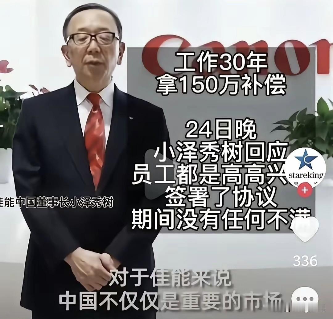 “佳能中国”关闭珠海工厂,与员工达成解雇协议!工作30年补偿150万,员工高兴签了协议,没有任何意见。 佳能是日本知名相机品牌,改革开放后入驻珠海,在中国经营几十年,应该赚了不少钱!当然也帮当地解决不少就业问题,为中国交了不少的税收! 为何关闭珠海工厂?应该原因如下: 1.互联网快速发展,智能手机社会普及,相机不再是家庭必备物品。 2.其他国外品牌进入,国内品牌崛起,冲击佳能市场份额,使其销售萎缩,入不敷出,不得已退出中国市场。 尽管佳能关闭珠海工厂,但按照中国法律,妥善解决解雇员工待遇补偿,就是遵法守规好企业,这个要肯定。 中国改革开放后,来华办厂外企很多,资料显示几十万家。主要是美欧亚发达国家,其中美韩日位居前三甲。 他们在中国赚了钱,也帮我们解决社会就业问题,为我们交了税收,为中国小康做了贡献。这些都应肯定的! …………