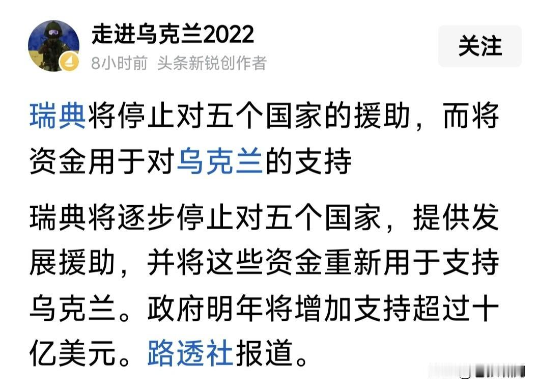 瑞典小国大担当:停止对非洲南美五国援助,省出钱满足乌“优先选项”!预计2026将省出100亿瑞典克朗(10亿美元),优先支持乌保家卫国。 瑞典停止或减少援助的五个国家是:津巴布韦,坦桑尼亚,莫桑比克,利比里亚与玻利维亚。分别位于非洲和南美,是世界有名贫穷落后国家。 苍狼由网友这篇报道,读出两个信息: 1.由于川普态度暧昧,老美援助迟缓,导致乌外援减少接续不上,急需盟友加码,瑞典当仁不让。其是欧洲援乌踊跃国家,援助总额名列前茅,明年要追加援助,道义担当令人感动! 2.瑞典地处北欧,面积45万平里,人口仅千余万,有寒冷地阔人稀特征。就这样的地方,竟发展成欧洲靠前水平的发达国家。与挪威丹麦类似,社会福利较好,民众生活水平比较高! 记得此前有报道,瑞典与英法德一样,曾接收不少非洲南美与中东难民。如今这些难民扎根结果,生育率远超当地居民,数量急剧增长,瑞裔与非瑞裔比例正在接近,引起社会不安。 苍狼想问的是:瑞典的外裔族群,应该是其援助的“津坦莫利玻”,这几个国家的难民吧?接收他们的原因,是因这些国家战乱动荡生活贫困吗? 此前报道称,美英法德的外裔族群,在以哈冲突期间“挺哈反以”,造成社会混乱。各国只得采取逮捕拘留遣返等相应措施,不知瑞典情况如何? 回归正题。无论瑞典接收非洲南美难民,还是竭尽全力援乌,都是道义担当!但两者相比,必须取其一时,立即舍弃前者专注前者。因为乌的胜败,更具世界意义。为瑞典点赞! …………
