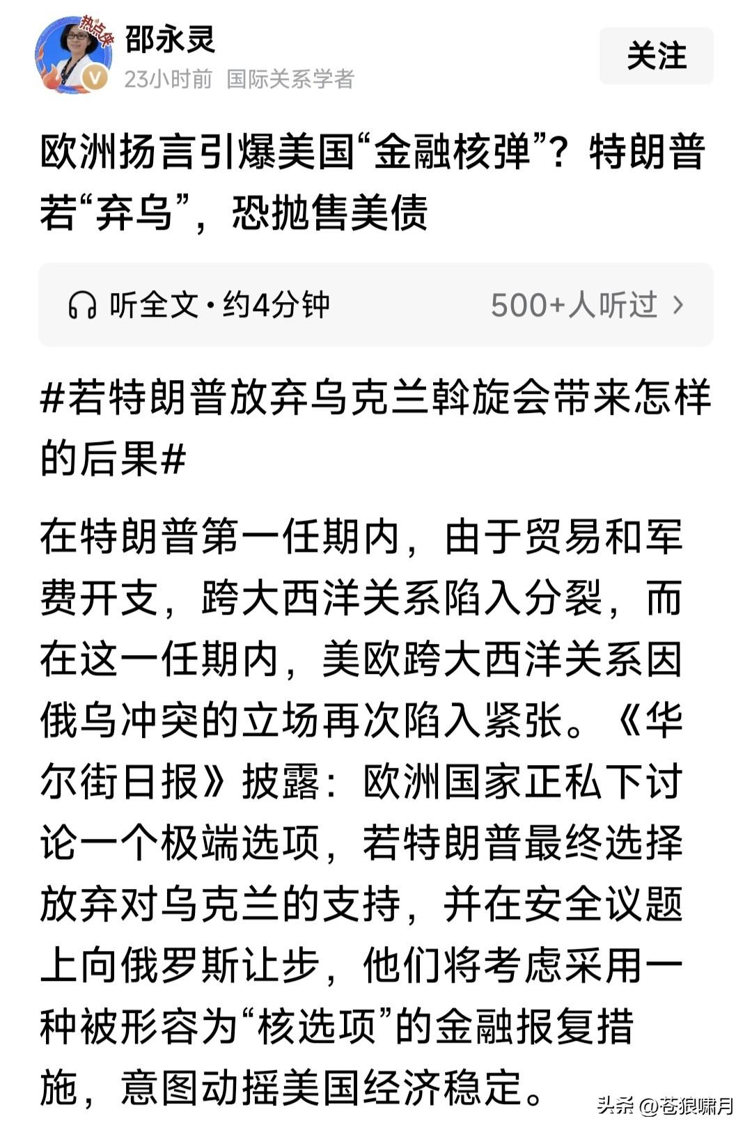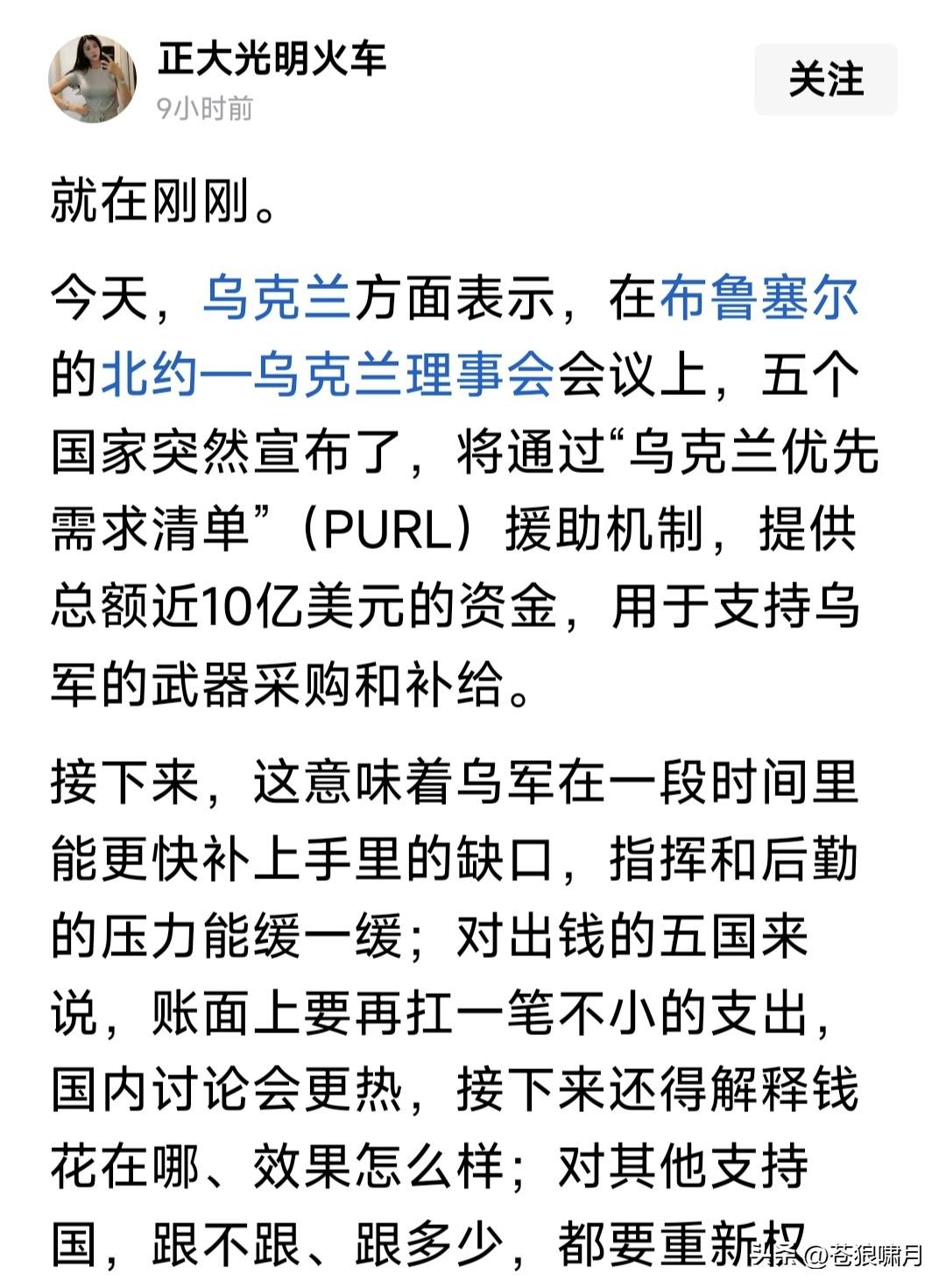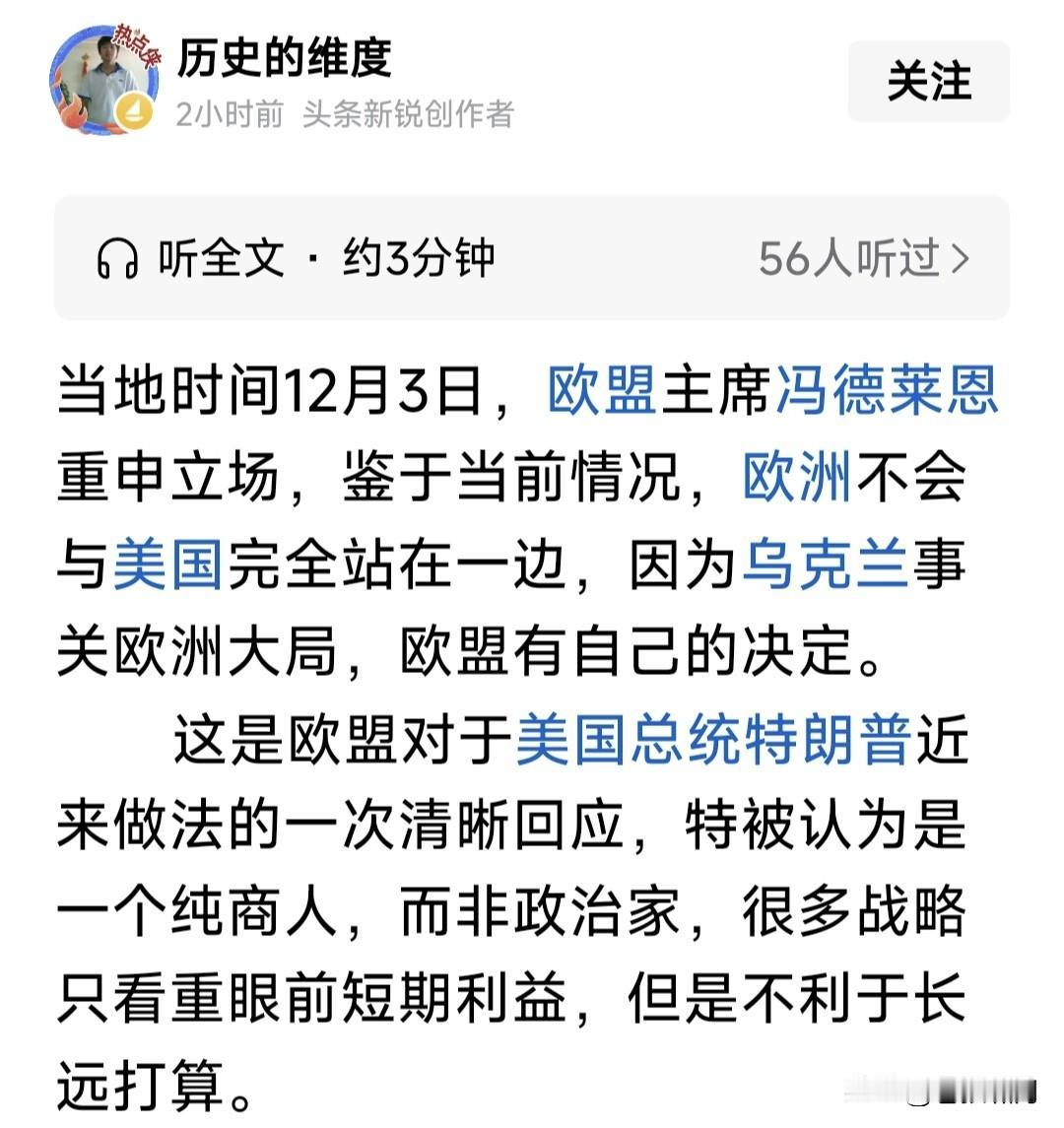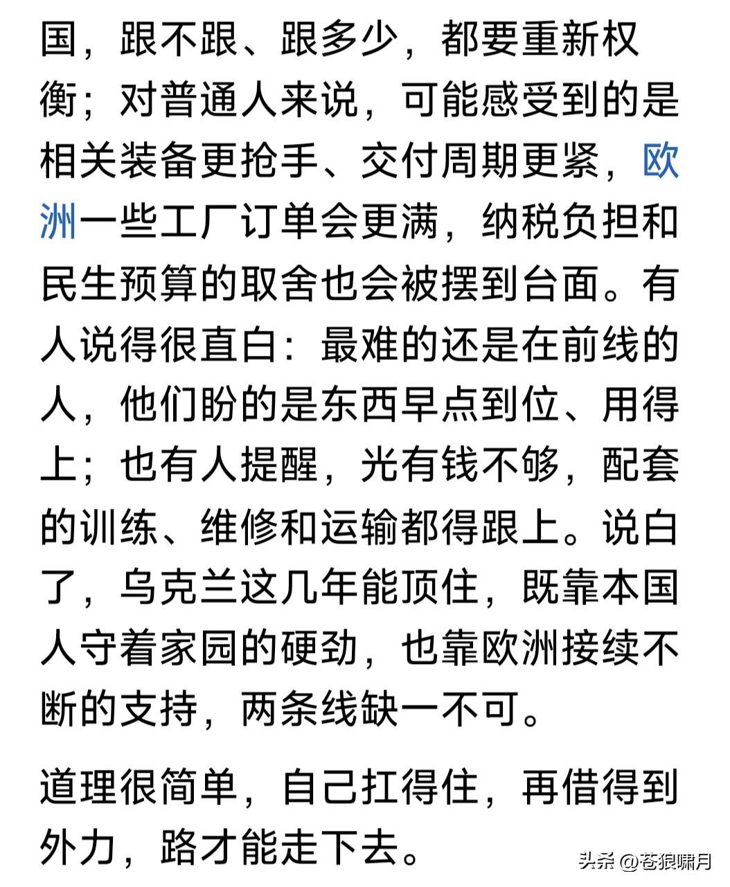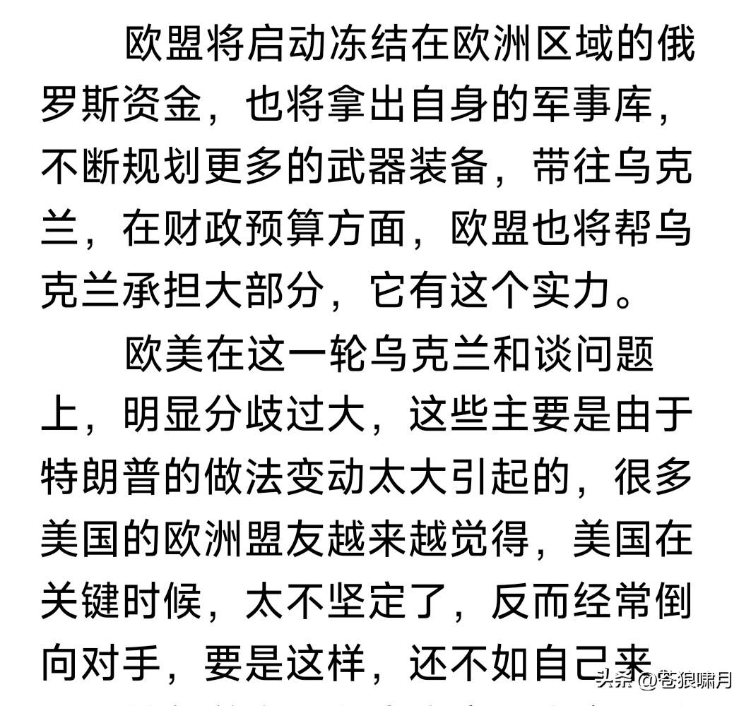 北约强硬挺乌,欧盟不甘落后!冯德莱恩最新发声:若俄乌战争继续,我们将增加战争成本,保证乌财政安全。 冯德莱恩这次发声,是对商人特朗普只要利益不顾道义,在俄乌战争问题上不坚持原则,导致无法停战的批评。 为应对美可能停止援乌,保证乌能够继续战斗!欧盟除了继续筹集资金,政策乌政府运转,还要把扣押俄海外资金,用于为乌购买武器,支持乌抵抗。 还有消息称,欧盟已经在酝酿:如美国真的抛弃欧乌,欧盟将予反击!杀手锏就是抛售美数万亿国债,果真如此,对美将是一大打击,重挫美国经济! 另据报道,为响应乌“需要10亿美元”,支撑乌运转和战斗的请求,北约5国根据“乌优先需求清单”,对乌紧急提供10亿美元援助,以解当下燃眉之急。 还有重磅消息,北约秘书长吕特宣布:澳大利亚与新西兰,将对乌提供援助。如此亚洲援乌国家,又增加两个。他们的援助,是“乌优先需求清单”吗? 这场俄乌战争,对世界影响太大!可能导致新的分化与组合。有人太过聪明,但聪明反被聪明误,反而会搬起石头砸自己的脚!比如商人总统特朗普。 苍狼觉得无论如何,世界趋势不会变:文明正义必胜!比如俄乌战争,唯一准则就是国际法和“联合国宪章”,撇开这个扯别的,都是“耍流氓”闲扯淡! …………