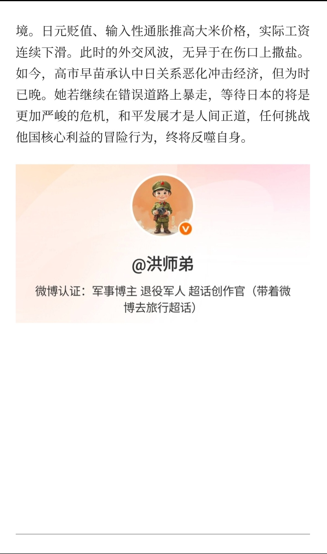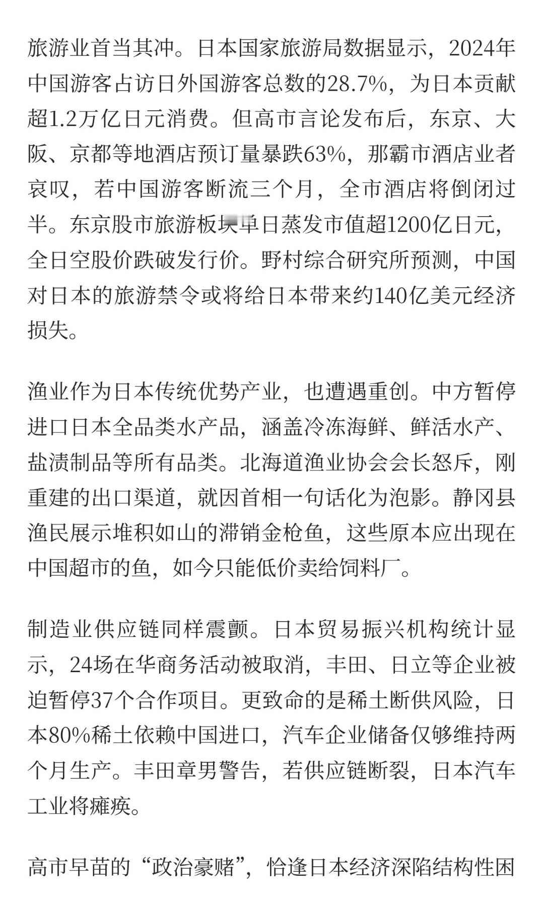 | 2025年12月9日,日本首相高市早苗在众议院预算委员会会议上承认,中日关系恶化对日本经济造成冲击。这一表态,距离其发表涉台错误言论已过去一个月,期间日本多个支柱产业接连遭受重创,这场由政治狂热引发的经济危机,正将日本推向悬崖边缘。高市早苗11月抛出的“台湾有事论”,创下日本战后首相三项“首次”——首次在正式场合将台海局势与集体自卫权挂钩、首次表露武装介入野心、首次对中国发出武力威胁。这一极端言论瞬间引爆中日关系危机,中方迅速采取反制措施,直击日本经济命脉。旅游业首当其冲。日本国家旅游局数据显示,2024年中国游客占访日外国游客总数的28.7%,为日本贡献超1.2万亿日元消费。但高市言论发布后,东京、大阪、京都等地酒店预订量暴跌63%,那霸市酒店业者哀叹,若中国游客断流三个月,全市酒店将倒闭过半。东京股市旅游板块单日蒸发市值超1200亿日元,全日空股价跌破发行价。野村综合研究所预测,中国对日本的旅游禁令或将给日本带来约140亿美元经济损失。渔业作为日本传统优势产业,也遭遇重创。中方暂停进口日本全品类水产品,涵盖冷冻海鲜、鲜活水产、盐渍制品等所有品类。北海道渔业协会会长怒斥,刚重建的出口渠道,就因首相一句话化为泡影。静冈县渔民展示堆积如山的滞销金枪鱼,这些原本应出现在中国超市的鱼,如今只能低价卖给饲料厂。制造业供应链同样震颤。日本贸易振兴机构统计显示,24场在华商务活动被取消,丰田、日立等企业被迫暂停37个合作项目。更致命的是稀土断供风险,日本80%稀土依赖中国进口,汽车企业储备仅够维持两个月生产。丰田章男警告,若供应链断裂,日本汽车工业将瘫痪。高市早苗的“政治豪赌”,恰逢日本经济深陷结构性困境。日元贬值、输入性通胀推高大米价格,实际工资连续下滑。此时的外交风波,无异于在伤口上撒盐。如今,高市早苗承认中日关系恶化冲击经济,但为时已晚。她若继续在错误道路上暴走,等待日本的将是更加严峻的危机,和平发展才是人间正道,任何挑战他国核心利益的冒险行为,终将反噬自身。