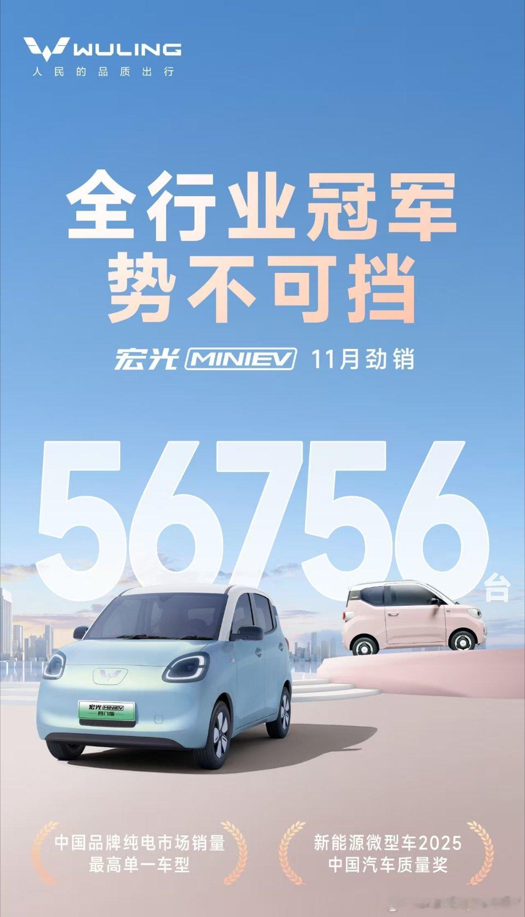 宏光MINIEV 11月劲销56756台,蝉联汽车全行业销量冠军,势不可挡!宏光MINIEV