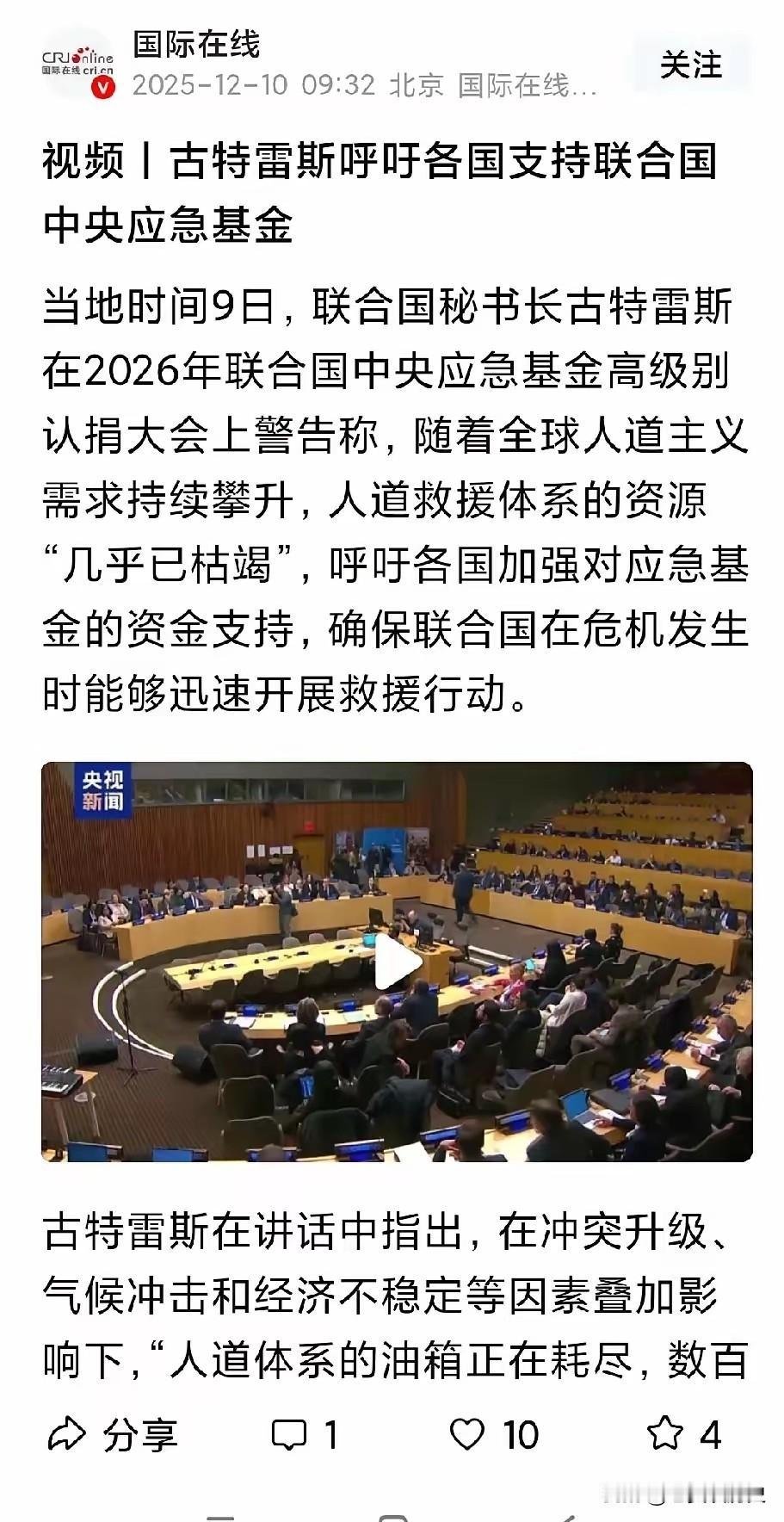 古特雷斯又要应急金了! 想想,我国硬刚日本一个月了,联合国装睡,说实话,这个联合国的眼里只有金钱利益,古特雷斯应该是有史以来最窝囊的秘书长,交了会费,正义却得不到支持,反观不交会费,美国却在联合国横冲直撞。 这话听起来刺耳,却是很多人心里憋着的一口气。我们规规矩矩按章办事,该出的钱一分没少,该守的理一句没丢。可到了关键时候,想听联合国说句公道话,怎么就这么难?那边海洋里的事闹得沸沸扬扬,一个月时间不算短,足够看清许多沉默背后的意味。 有时候真觉得,联合国这台机器是不是有些生锈了。它本该是维护公理的殿堂,如今却总飘着一股算计的味道。看看会费缴纳榜就明白,中国一直是模范生,承担着全球第二多的常规摊款。可模范生的待遇,似乎并未换来应有的尊重。 反而某些国家,会费常年拖欠,动辄数以亿计美元。他们说话的声音却一点没变小,行事风格依旧霸道。这种反差让人不得不思考,国际舞台的规则,到底是谁在制定?又是为谁服务?古特雷斯秘书长的难处或许真有,但在其位,若不能更有力地捍卫宪章精神,历史评价恐怕不会太客气。 国际政治从来不是童话故事。没有实力支撑的正义,往往声音微弱。但这不意味着我们应该对失衡的现状习以为常。我们的贡献,每一分都代表着责任与承诺,这份重量应当被看见,被尊重。 世界在变化,旧的平衡正在松动。越来越多国家开始质疑:为什么交了钱的要忍气吞声,欠了钱的反而趾高气扬?这种质疑本身,就是一种力量的觉醒。它提醒所有人,多边主义不是某个国家的私人玩具,公平正义不该成为奢侈品。 把钱用在刀刃上,把理摆在台面上。这是普通人都懂的道理,国际组织更该如此。应急金固然重要,但比钱更急需的,是找回失去的公信力。当大国小国都能在规则面前平等,当正义不再需要高昂的“会费”来购买,联合国才能真正成为所有人的联合国。 各位读者你们怎么看?欢迎在评论区讨论。 中国联合国 中国联合国实力 联合国怒怼现场