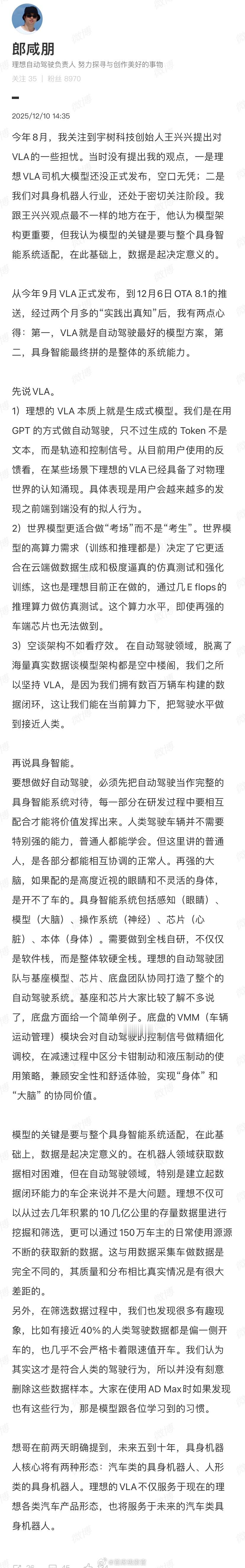 理想高管回应王兴兴质疑理想自动驾驶负责人郎咸朋发布长文,回应了王兴兴的质疑,表示他与王兴兴的观点不同,他认为模型的关键是要与整个具身智能系统适配,在此基础上,数据是起决定意义的。308_IO新能源汽车