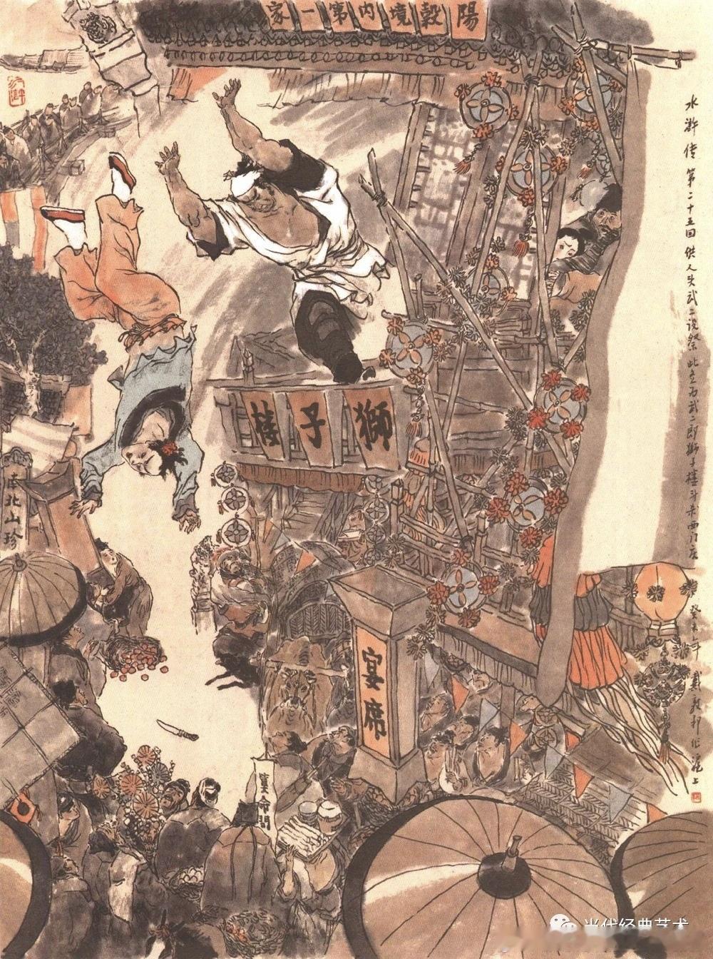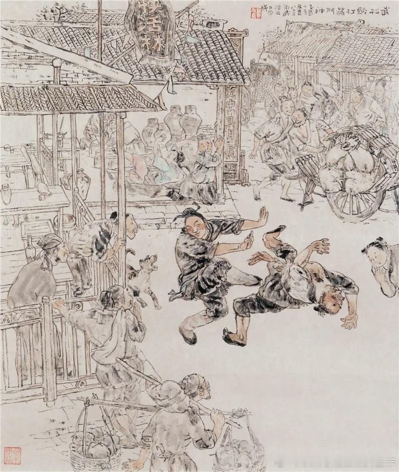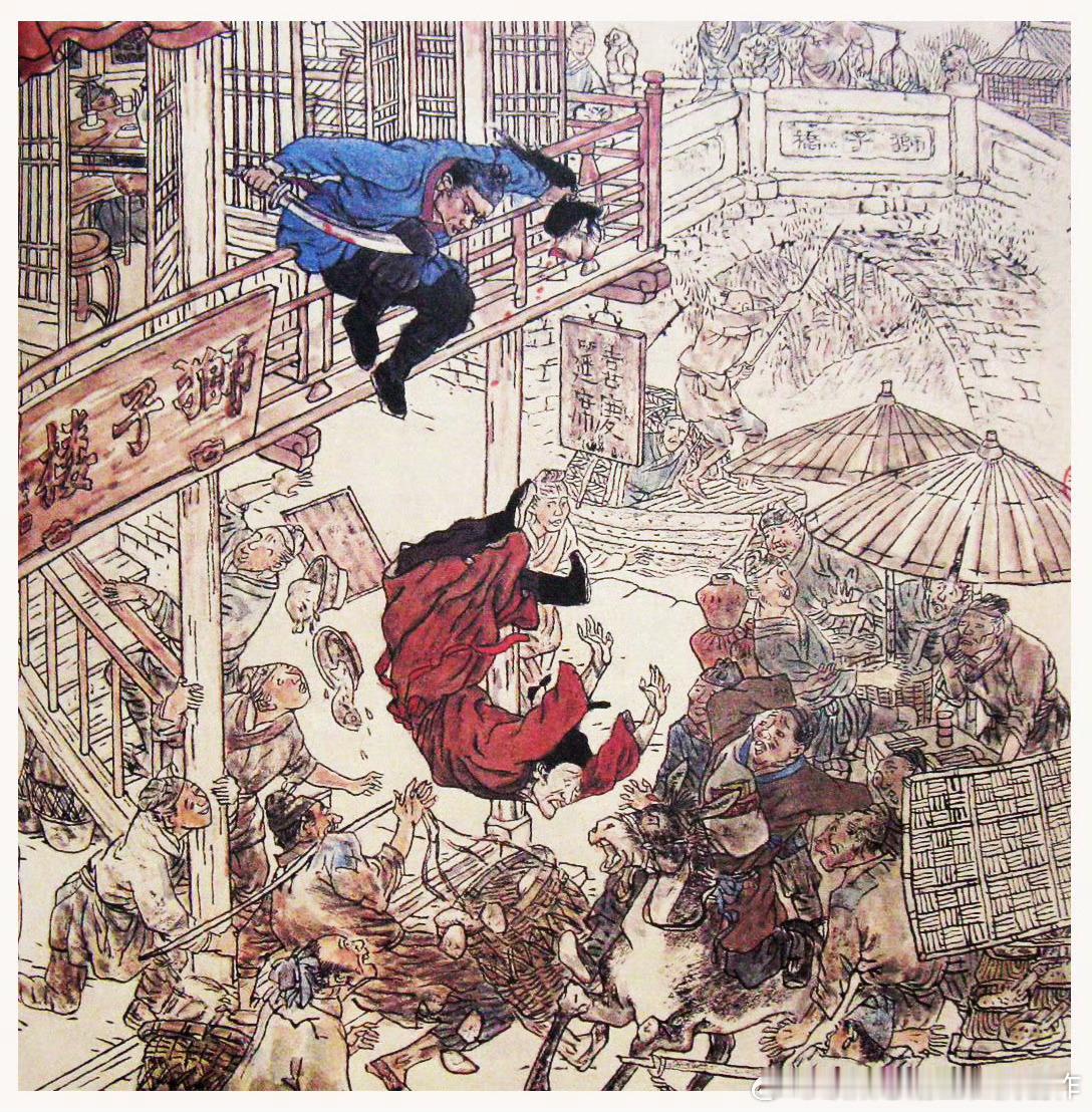 相同的故事,两位画家不同风格的作品。醉打蒋门神,图一戴敦邦,图二贺友直。狮子楼,图三戴敦邦,图四贺友直。我非常喜欢图二贺友直画的那幅醉打蒋门神。