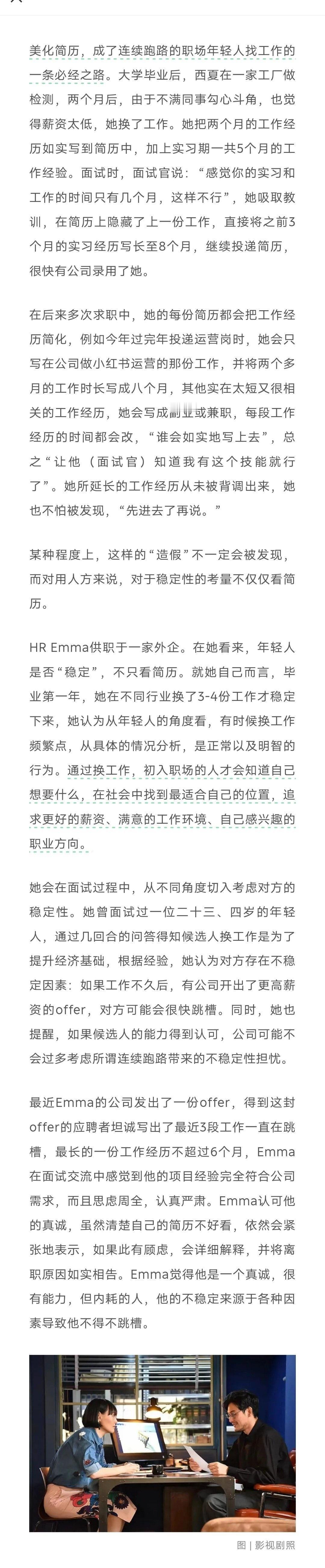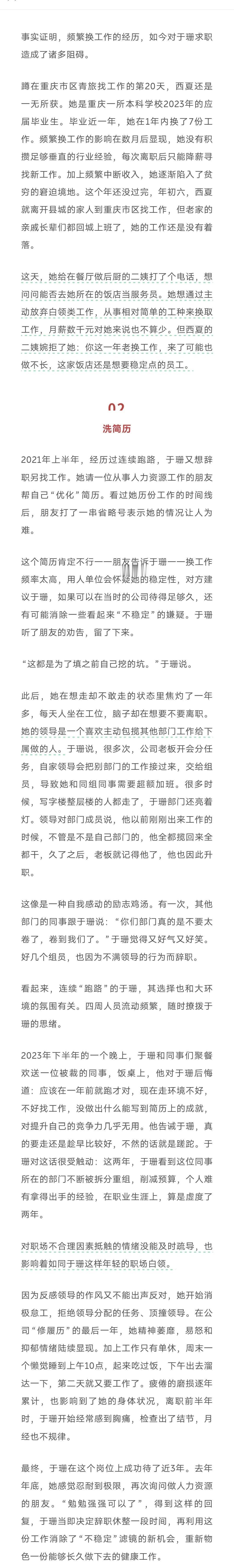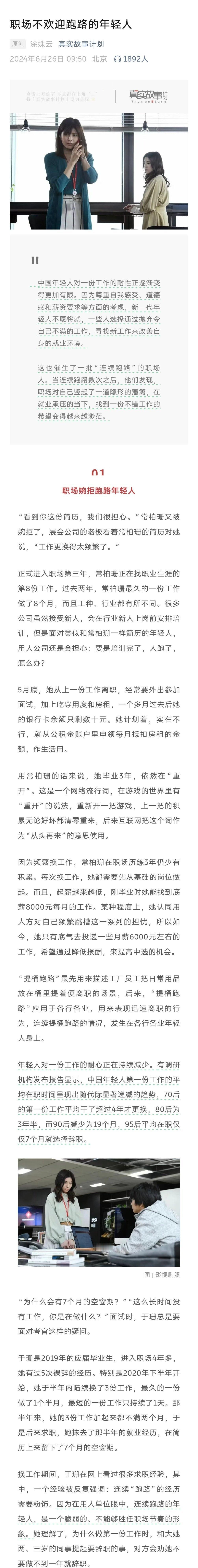 【职场不欢迎跑路的年轻人 】太爱辞职了但完全没gap 中国年轻人对一份工作的耐性正逐渐变得更加有限。因为尊重自我感受、道德感和薪资要求等方面的考虑,新一代年轻人不愿将就,一些人选择通过抛弃令自己不满的工作,寻找新工作来改善自身的就业环境。 这也催生了一批“连续跑路”的职场人。当连续跑路数次之后,他们发现,职场对自己竖起了一道隐形的藩篱,在就业承压的当下,找到一份不错工作的希望变得越来越渺茫。 plq阅读全文👇
