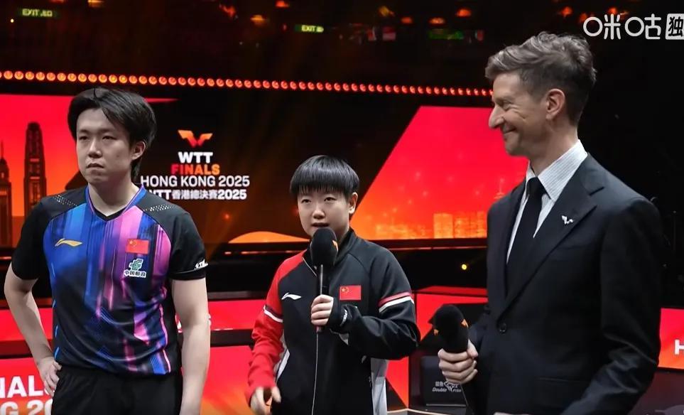 国际乒联首席记者亚当看着莎莎回答问题,就像看自家人一样亲切。 香港总决赛莎头战胜印度队,记着火速跟上祝贺。话筒先递到了楚钦手里,楚钦看了下很自然给了莎莎。 只要楚钦和莎莎在一起,莎莎基本都是代言人。 亚当深有感触。 看着莎莎流畅的发言,太喜欢了!