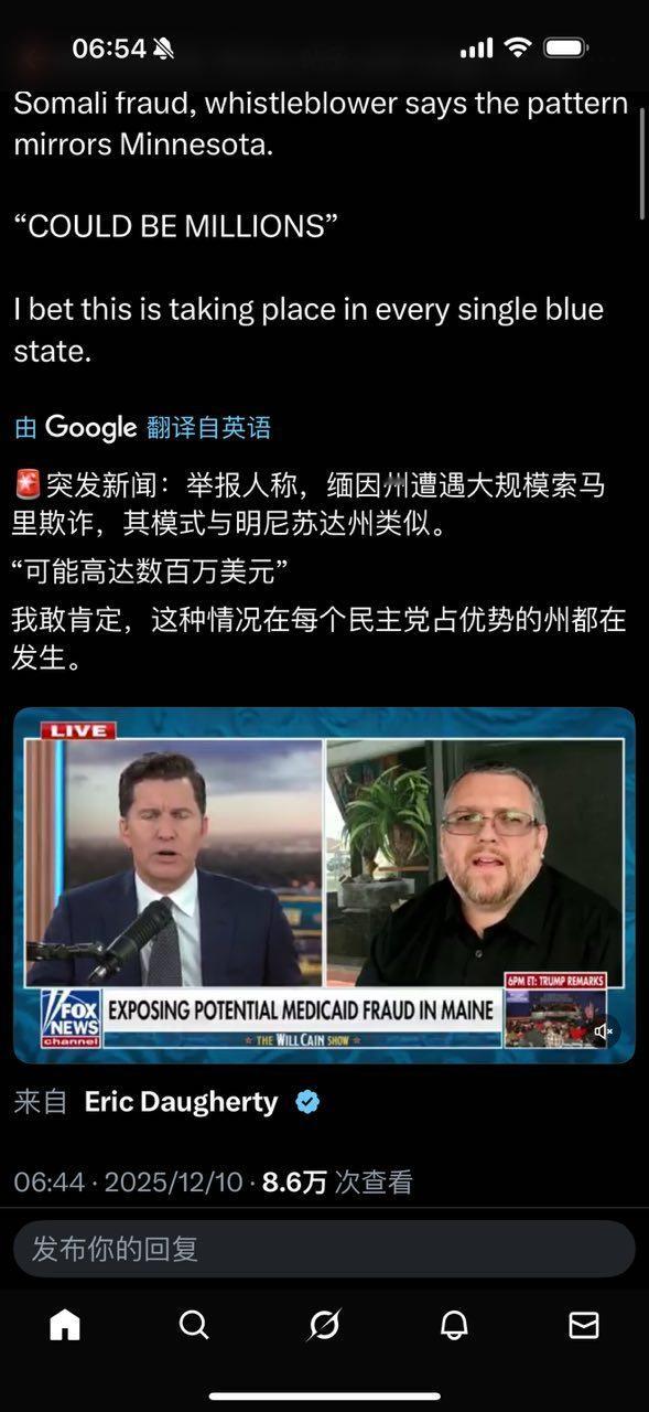 突发新闻:举报人称,缅因州遭遇大规模索马里欺诈,其模式与明尼苏达州类似。"可能高