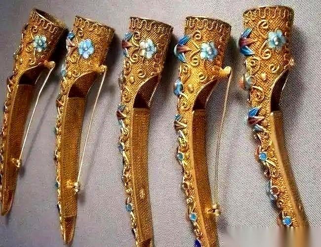 以前看宫斗剧,一直以为那些娘娘们戴长长的指甲套,纯粹是为了好看,臭美。直到今天才明白,那玩意儿压根不是给她们自己戴的。 殊不知,这小小的护甲套背后,藏着清代宫廷女性的生活美学与森严等级。 “身体发肤,受之父母,不敢毁伤”这句出自《孝经》的古训,正是古人蓄甲的伦理基础。 在清代后宫,留长指甲不仅是美的追求,更是孝道的体现。 当时皇后、嫔妃们极其爱惜自己的指甲。 蓄一根一寸(约3.3厘米)长的指甲,通常需要半年以上。 而且这期间稍不留神,指甲就会劈裂折断,前功尽弃。 于是,保护指甲成了头等大事。 而且留长指甲还有一个潜台词:我不用干粗活。 因为在农业社会,长指甲是脱离体力劳动的标志,成为上层社会的身份象征。 当时元代欧洲旅行者鄂多立克在其《东游录》中记载:“留长指甲是该邦生长名门的标记,有些人把大拇指指甲留长到超过手掌。” 老是断,那咋整了,于是发明了指甲套。 而且这些指套一般套在无名指和小指上,大拇指因需要灵活操作通常“免戴”。 护甲套的设计充满智慧。 它们多采用镂空设计,背面尤其如此,这样空气可以流通,夏季佩戴也不会感到闷热。 制作工艺包括镂空、錾花、镶嵌等,纹样从基部到指尖顺势而收,自然流畅。 而且 护甲套的材质多样,有金、银、玉、玳瑁、铜、珐琅等。 比如现藏于中国国家博物馆的一件金镶石珠指甲套,长10厘米,用细金丝编织焊接而成。 上部弧形,套环图案上缀五朵兰花,兰花由珍珠串和红绿宝石组成,兰叶为点翠装饰,整体修长秀丽,十分华贵。 而且护甲套在清代特别流行,这与满族妇女的盛装打扮密切相关。 想象一下:满族贵妇梳着高耸的“两把头”发髻,穿着四五寸高的高底鞋,上衣配着马蹄袖。 如果没有修长的手指和护甲套相匹配,从唯美角度看,确实“很不搭配”。 护甲套使整体造型达到和谐统一,给人一种尊贵富裕的美感。 这全身的“行头”无一不在宣告主人的身份和地位。 一位清史专家打了个有趣的比方:“这就像今天的女性搭配服装和配饰一样,清代后宫女性是从头到脚的整体造型设计。” 而且在等级森严的清代后宫,护甲套也不例外地成为地位和身份的象征。 影视作品里,似乎所有后宫女性都可以戴护甲套,实则不然。 据说,只有位分较高的妃嫔才有资格戴,答应、常在等低位分的女子是不能戴的。 就是有幸能戴护甲套的妃嫔,也要遵守严格规定。 这皇后可以戴六个,而妃子可以戴四个,嫔只能戴三个。 还有在材质上也有讲究,皇后可以用金的,妃子可以用陶瓷的,嫔位的就只能用银的。 在装饰上,身份越尊贵的妃嫔,护甲套的工艺越繁复精美。 例如皇后的护甲套上,每支可以镶三颗东珠,一般妃子每支可以镶两颗东珠,嫔不可以用东珠,只能用一般珍珠。 说到护甲套,不得不提清末的慈禧太后。 她是护甲套文化的集大成者,堪称护甲套的“形象代言人”。 据德龄公主在《清宫二年记》中记载,慈禧太后“右手罩以金护指,长约三寸;左手两指,罩以玉护指,长短与右手同”。 慈禧对护甲极为讲究,洗漱完毕后会浸泡、刷洗、休整指甲,还要涂上指甲油。 有史料记载,慈禧的指甲套最长达到七八寸(约20多厘米),这可谓将护甲文化推向了极致。 护甲套并非清代首创,其历史可以追溯到更早的时期。 据《韩非子》记载,战国时韩国国君韩昭侯周围的侍臣,全都蓄着长甲。 而且现在能看到的最早的护甲套是吉林省老河深地区出土的汉代金护指,它由薄薄的金片卷曲而成,呈螺旋状向上延伸,粗细长短可任意调节,简练而实用。 唐代贵族妇女也重视手的装饰。 唐代诗人韩翭在《咏手》诗中赞美女性双手:“腕白肤红玉笋芽,调琴抽线露尖斜”。 而这里的“玉笋芽”就是形容女性纤柔修长的指尖,如刚生出的鲜嫩笋芽。 清代是护甲套发展的鼎盛时期,制作工艺和文化内涵都达到了顶峰。 在故宫博物院收藏的一幅美国画家为慈禧太后所画的油画肖像中,慈禧的手上就戴着以金、玉两种质料制成的长护指。 如今,护甲套已退出历史舞台,但其承载的文化内涵和工艺精神仍值得我们品味。 现代美甲艺术中,也能看到古代护甲文化的影子:端午绘龙舟、七夕画鹊桥的定制设计,正是对传统节俗的时尚回应。 而古人为护甲而制的指套,在当代衍生出可拆卸的“穿戴甲”潮流,让长甲从贵族专享变为大众时尚。 这种古今对话,正是传统文化生命力的体现。 下次当你看到这些精美的护甲套,不妨想象一下清代后宫女性戴着它们行走在高墙深宫中的情景。 这些护甲套不仅保护了她们精心养护的指甲,也默默诉说着那个时代的故事与审美。 主要信源:(清朝妃子为何要戴长指甲套?除了美观外,主要是为了方便皇帝——搜狐网)