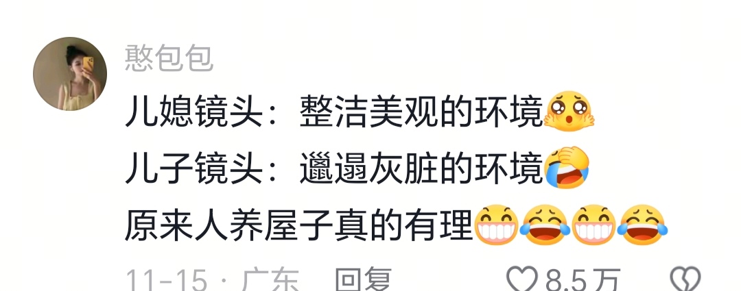 儿媳镜头:整洁美观的环境 儿子镜头:邋遢灰脏的环境
