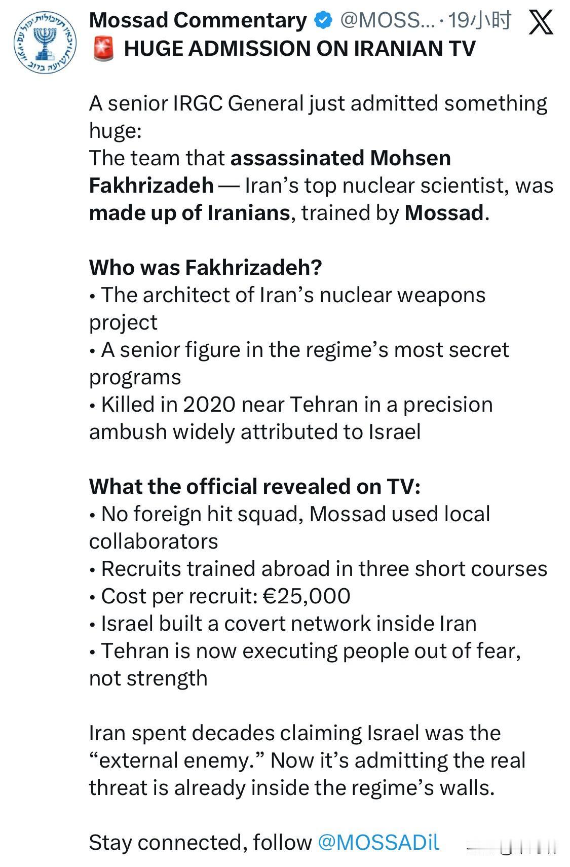 伊朗电视台播出重大新闻:伊朗伊斯兰革命卫队总司令顾问易卜拉欣·贾巴里 (Ebrahim Jabbari)刚刚在当地电视台的一档节目中揭密了一件惊天大事: 刺杀伊朗顶级核科学家莫森·法赫里扎德的团队由伊朗人组成,他们接受过摩萨德的训练。 法赫里扎德是谁? • 伊朗核武器项目的策划者 • 该政权最机密计划中的高级人物 • 2020年在德黑兰附近遭以色列精心策划的伏击身亡 这位官员在电视上透露的内容: • 没有外国暗杀小组,摩萨德使用的是当地合作者 • 新兵在国外接受了三门短期课程的培训 • 每次招募成本: € 25,000 以色列在伊朗境内建立了一个秘密网络。 • 德黑兰现在处决民众是出于恐惧,而非实力。 伊朗几十年来一直声称以色列是“外部敌人”。现在它却承认,真正的威胁其实就在政权内部。