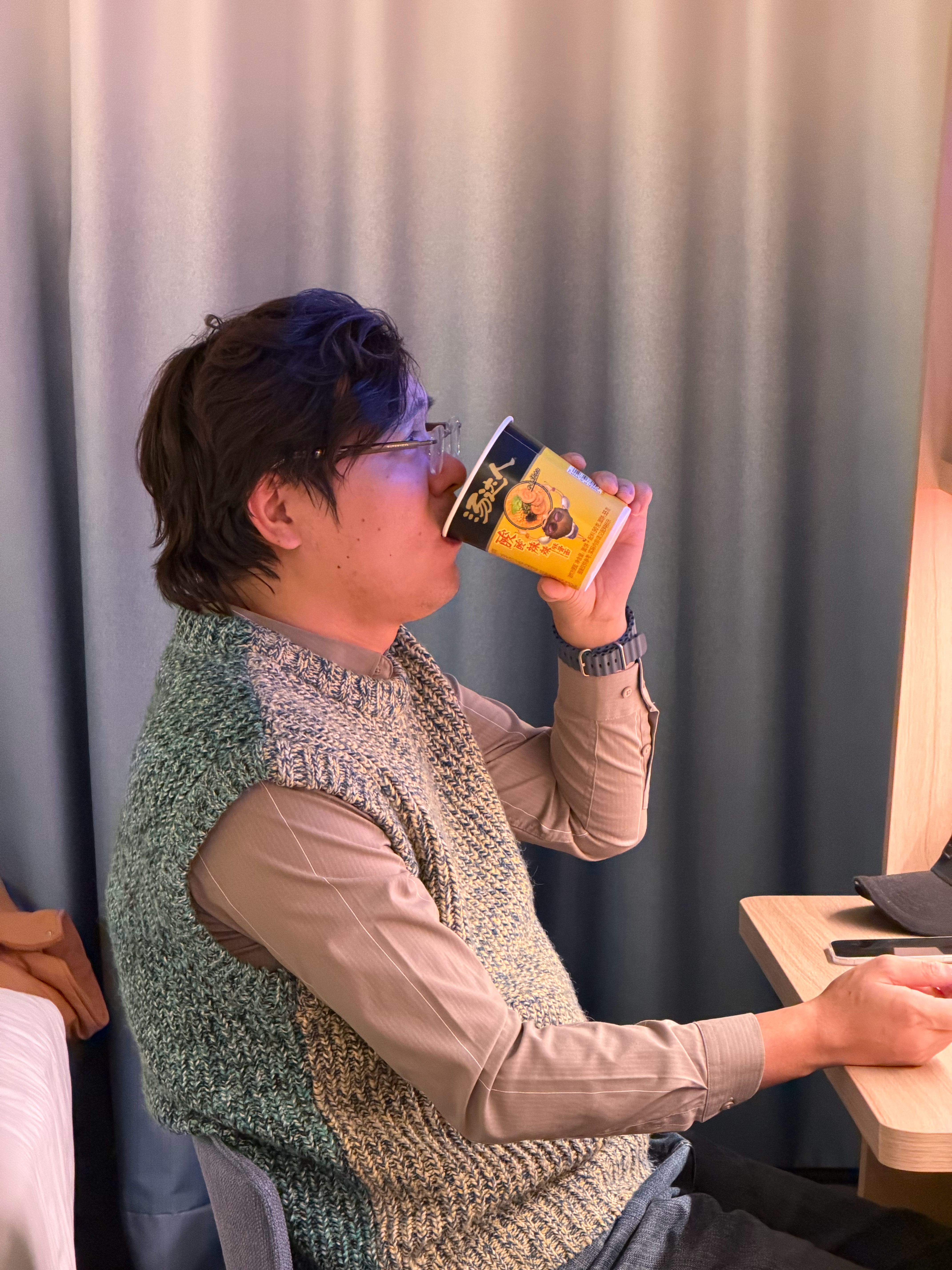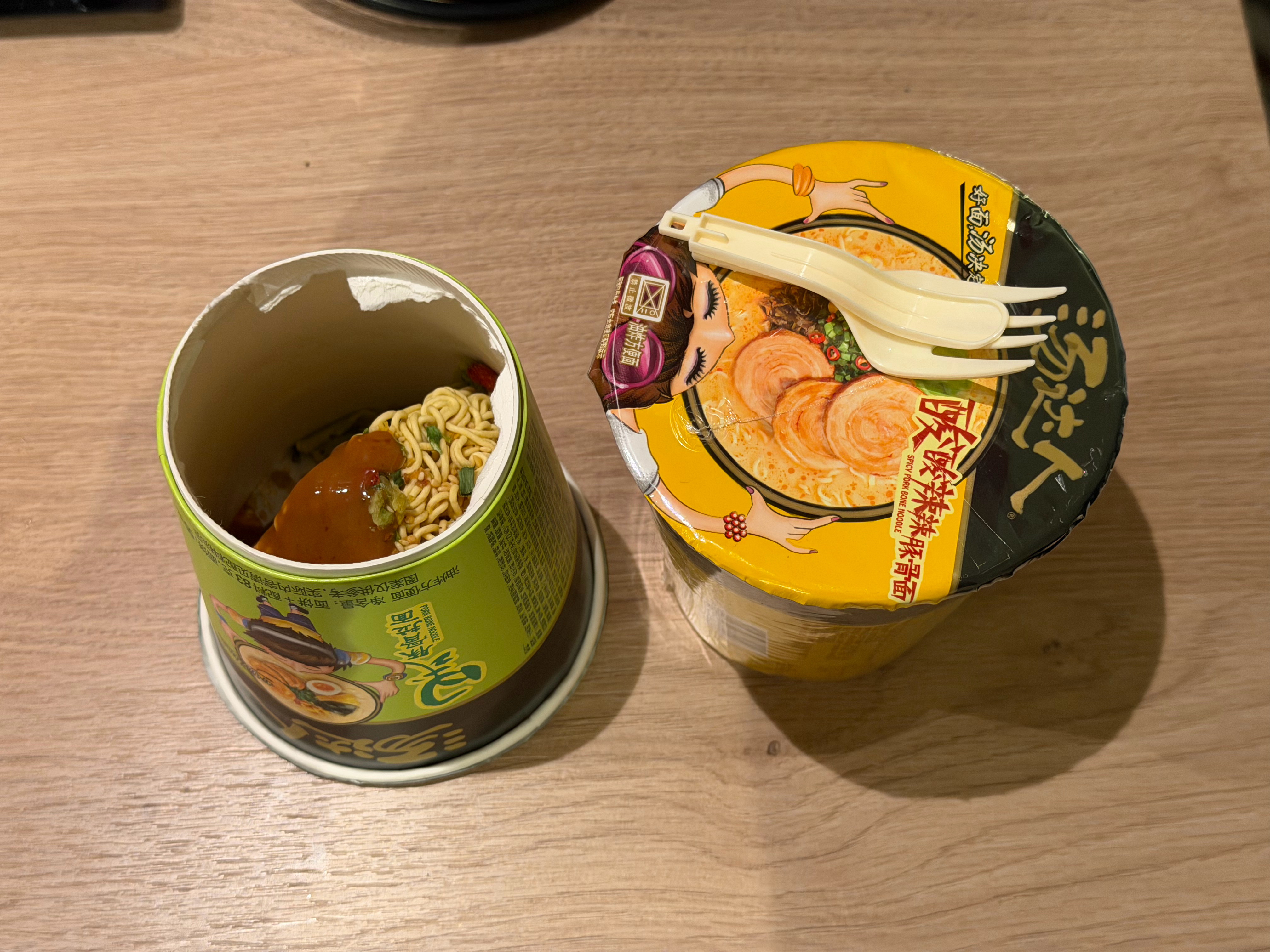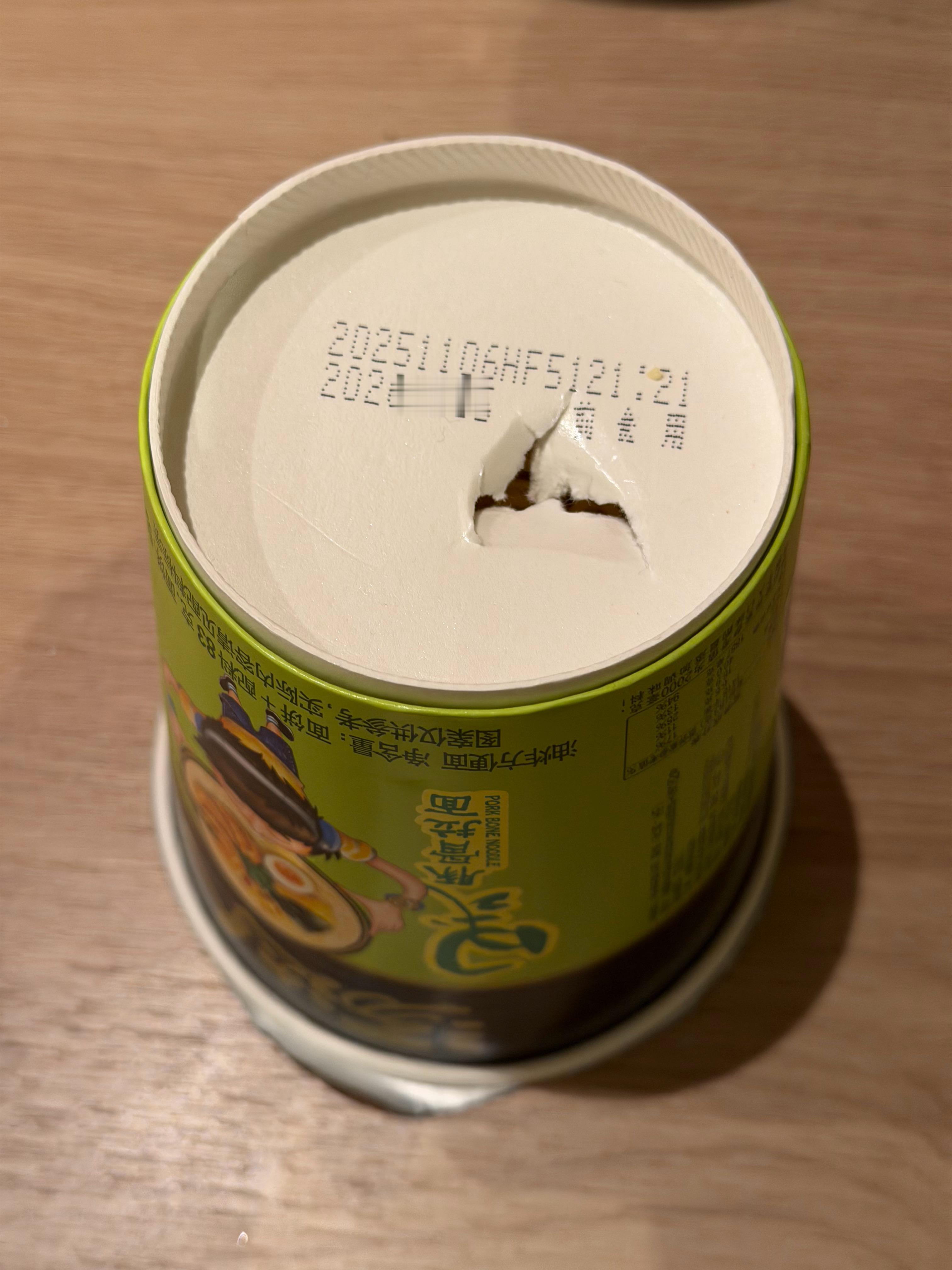 去欧洲的时候不是带了两桶泡面吗,其中一桶的底部被摄影支架给捅破了但是人在外身不由己,所以跟一起,瓜分掉了,好的那杯给陈曦吃了,我吃破的这杯,第一次从底部倒过来吃,真怕盖子不结实直接天塌了这个情景特别符合一个图6的表情包。
