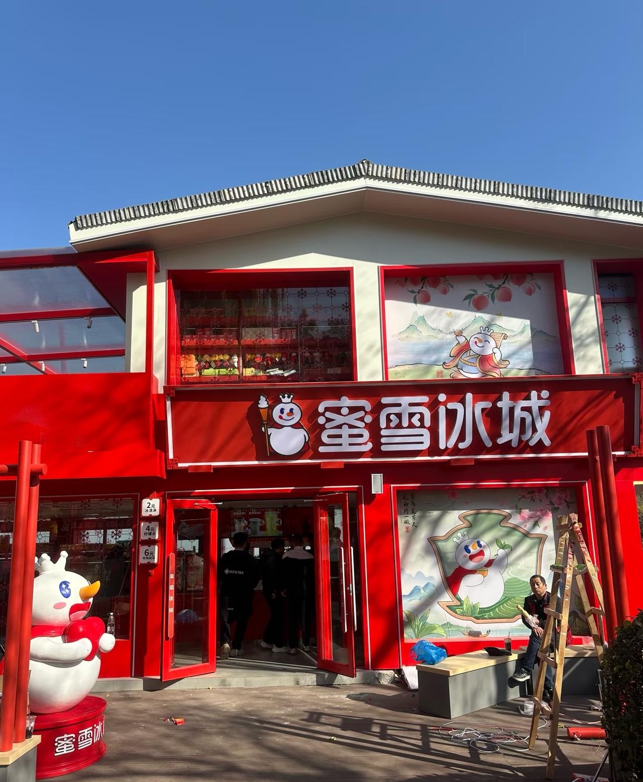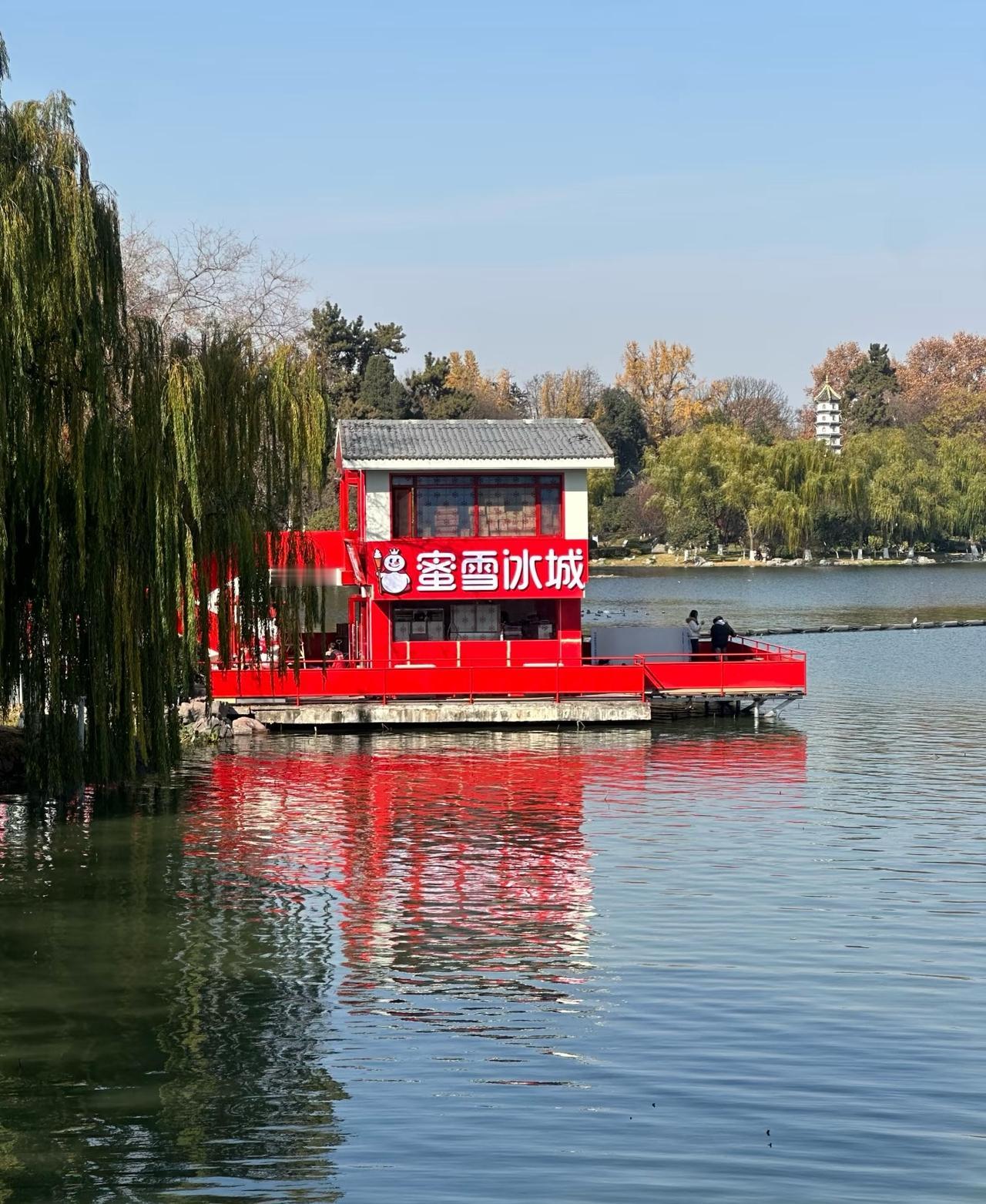 蜜雪冰城开在玄武湖了。 之前逛玄武湖只能喝茶颜瑞幸,终于能喝小雪了。古建用红色没什么问题,主要是二层白墙面、店招风格和整体上有些割裂,按理讲蜜雪这种规模的品牌,在景区会有一套独立的UI设计。