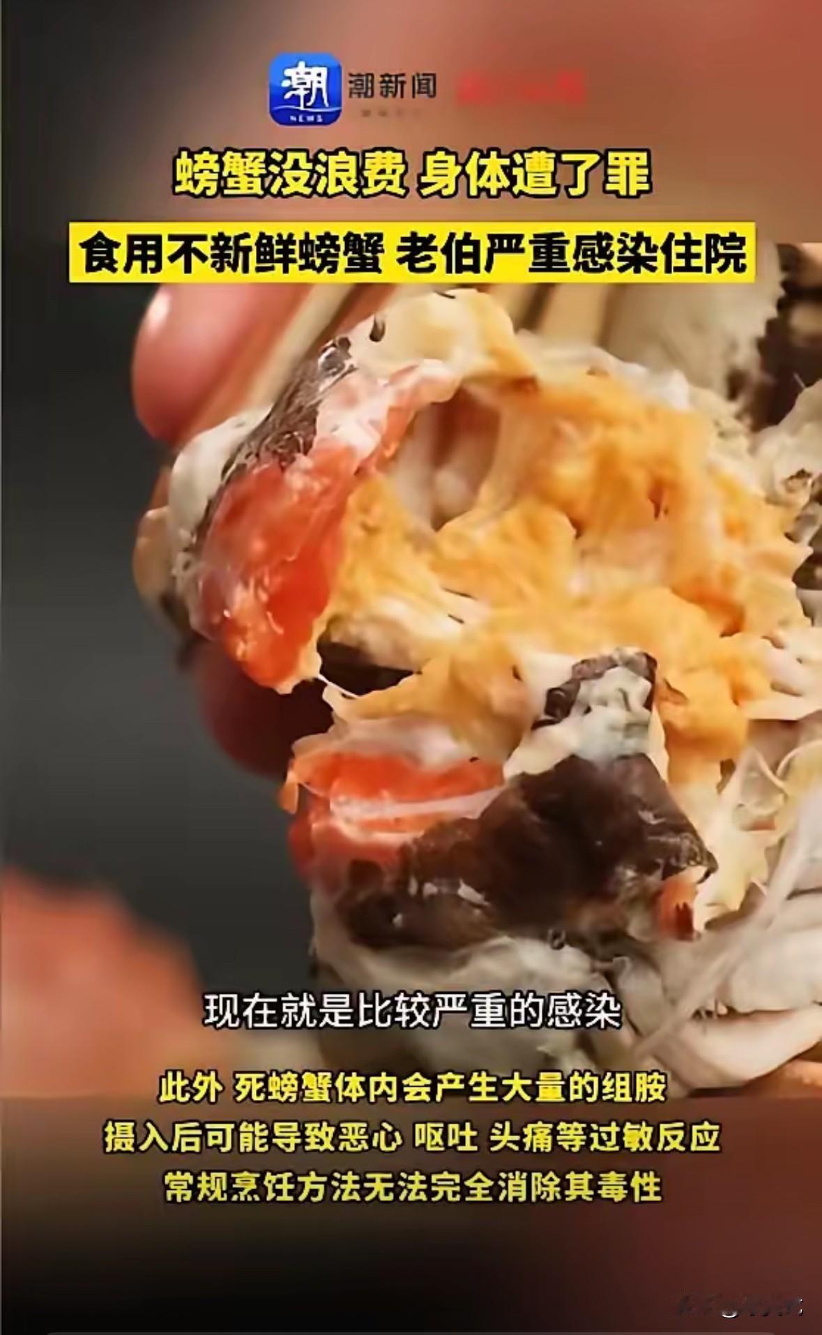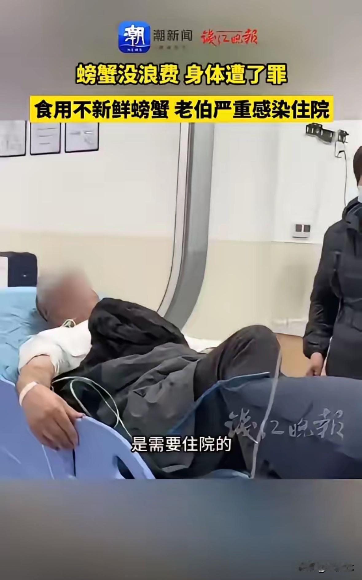 “省钱的代价!”近日,上海,一老人为避免浪费,将家中存放三天的大闸蟹煮熟吃光,没想到吃完不久后就开始上吐下泻,发起了高烧,家人见状连忙将他送往医院诊治,发现是因为食物中毒引起的严重感染。网友:该扔就得扔。 小区业主群里弹出这条消息时,李阿姨正在厨房收拾剩菜,心里“咯噔”一下。点进去一看,配图是张医院的缴费单,发消息的是楼上的王大爷儿子,文字里满是懊悔:“我爸为了不浪费,把冰箱里放了三天的大闸蟹煮了全吃了,现在在急诊打吊瓶呢!” 这事说起来,还是三天前的事。王大爷前几天去菜市场,见大闸蟹打折,一时贪便宜买了十只,个头还挺大,紫褐色的背壳泛着光,掂量着就沉手。回家清蒸了四只,老两口吃得美滋滋,剩下六只装在网兜里,往冰箱冷藏室一塞,想着隔天再吃。 可第二天王大爷的老战友来串门,中午请去馆子吃了烤鸭,大闸蟹没顾上。第三天又赶上小区停水,家里乱糟糟的,做饭都成了麻烦事,那兜螃蟹就还在冰箱里待着。 今儿一早水来了,王大妈收拾冰箱,瞅着那几只螃蟹,皱着眉说:“放三天了,要不扔了吧?万一坏了呢?” 王大爷一听就不乐意了:“扔啥扔?这玩意儿多贵啊!我闻着没臭味,蒸透了肯定没事。”他这辈子过惯了省吃俭用的日子,见不得半点浪费,小时候饿过肚子的人,对“扔东西”这事儿特别敏感。 说着就把螃蟹拎出来,解开网兜一看,有两只爪子还轻微动了动。“你看,这不还活着嘛!”王大爷更得意了,上锅、加水、开火,蒸得冒热气,出锅时蟹黄凝固成橙红色,看着还挺诱人。 他自己就着两瓣蒜,愣是把六只螃蟹全吃了。王大妈劝他:“慢点吃,别撑着。”他还乐呵呵地说:“没事,这玩意儿高蛋白,补着呢。” 结果下午两三点,王大爷就不对劲了。先是觉得肚子疼,像有虫子在里头钻,接着就跑厕所,上吐下泻没停过,脸色白得像纸,额头烫得吓人。王大妈慌了神,赶紧给儿子打电话,火急火燎送进医院。 急诊室里,医生一问情况,再看王大爷的症状,当下就判断是食物中毒:“螃蟹这东西,冷藏最多放一天,超过48小时就容易滋生细菌,尤其是鳃和内脏里,就算看着没坏,病菌也早超标了。” 抽血化验结果出来,果然是细菌性感染,白细胞飙得老高,得住院打抗生素。王大爷躺在病床上,挂着吊瓶,有气无力地说:“早知道……早知道扔了就好了……” 儿子在一旁又气又心疼:“爸,跟你说过多少回,剩菜别舍不得扔,尤其是海鲜!你这遭的罪,比那点螃蟹值钱多了!” 这事在业主群里炸开了锅。 “我家也有这情况,老人总说‘没坏就能吃’,说了多少次都不听!” “上次我妈把放了五天的粽子热了吃,拉了两天肚子,现在还犟呢!” “可不是嘛,勤俭节约是好,但也得分东西啊,该扔就得扔,别拿身体开玩笑!” 王大妈在病房外给李阿姨打电话,声音都带着哭腔:“以后可不敢省这钱了,我家那口子要是有个三长两短,我可咋整……” 傍晚时分,夕阳透过急诊室的窗户照进来,王大爷睡着了,眉头还皱着。床头柜上放着没吃完的半个馒头——他连这馒头都念叨着“明天热了还能吃”。王大妈看着那馒头,悄悄扔进了垃圾桶,心里默念:“以后啊,该扔就得扔,啥都没老伴的身子金贵。”
