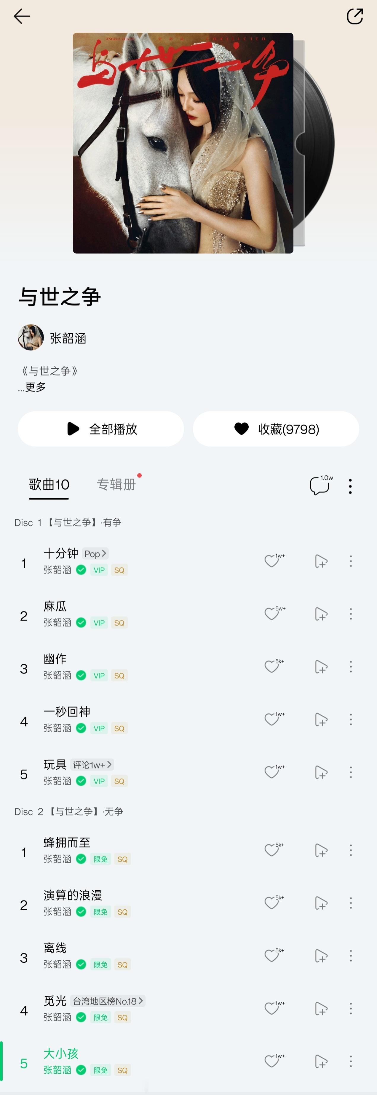 张韶涵《与世之争》的下半张专辑终于来了……比起上半张五首有点『用力过猛』的呈现,这五首明显好多了,。《大小孩》和《演算的浪漫》听第一耳朵就挺喜欢的,一看作曲,一个是钱雷一个是吴青峰,难怪呢……