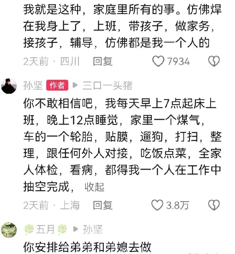 看孙坚哭红眼睛吐槽,真的破防了!37岁的男人,从早七点忙到深夜十二点,又要搞事业又要 包揽全家琐事,煤气维修、轮胎更换、手机贴膜全是他,父母却只甩一句“能者多劳”。 重组家庭里,妈妈为了当“好后妈”偏心继弟,弟弟啃老摆烂,他事业有成反倒成了“原罪”。付出再多不被心疼,稍有怠慢就遭指责,这种“强者必须牺牲”的逻辑,本质就是最残忍的亲情绑架。 很多家庭都这样,把能干孩子的付出当理所当然,却把偏爱全给了不争气的那个。孙坚的崩溃,戳中了无数被“能者多劳”PUA的人——懂事的孩子从不敢喊疼,可再坚强的心,也经不住常年的忽视和消耗。 亲情该是温暖的港湾,不是单方面的压榨。你身边也有这种“越能干越受委屈”的情况吗?