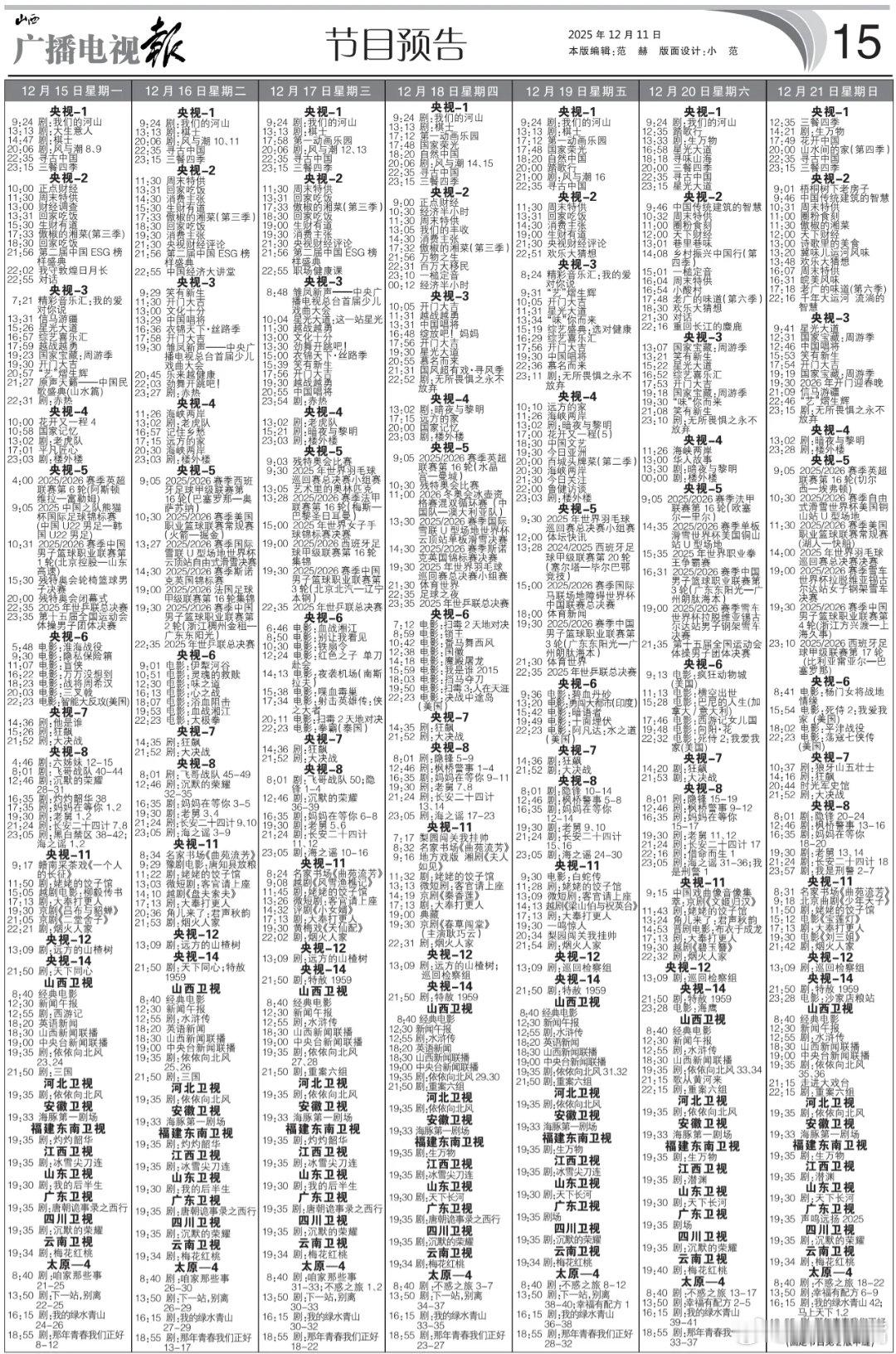 电视报来啦!12月15日至12月21日黄金档电视剧编排!央一:《风与潮》周一到周五,周五21:00单集央八:傍晚档《妈妈在等你》 黄金档《老舅》 次黄档《长安二十四计》2集,20日起每天1集东南:生万物江西:潜渊山东:天下长河
