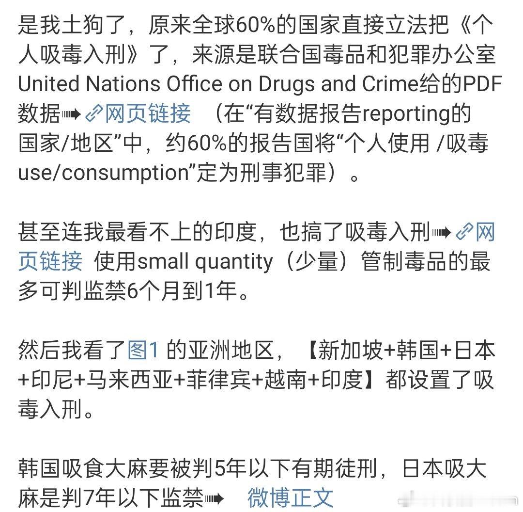 罗翔撰文谈吸毒入刑问题多说无益,就问中国要不要跟国际社会接轨?全球60%的国家直接立法把个人吸毒入刑的。就连印度都设置了吸毒入刑。大部分亚洲国家都是吸毒入刑。说明吸毒入刑就是跟国际社会接轨啊。而且中国和印度同时作为14亿人口的大国,同等人口规模的国家案例更有参考价值。
