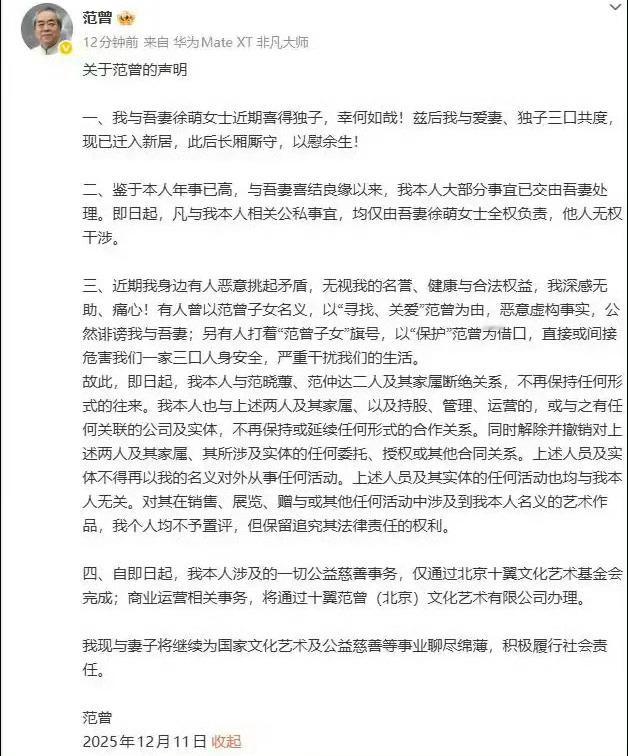 87岁范曾得子范曾与女儿继子断绝关系现年87岁的著名书画家范曾于近日公开发文,透露自己近期喜得一子,并与妻子及独子迁入新居,表示将“三口共度”。他在文中同时宣布,因身边有人“恶意挑起矛盾”,决定与女儿范晓蕙、继子范仲达及其家属断绝关系。范曾于2024年宣布与当时35岁的徐萌结婚。今年8月,其女儿范晓蕙曾公开表示父亲被徐萌带离原住处后失联。