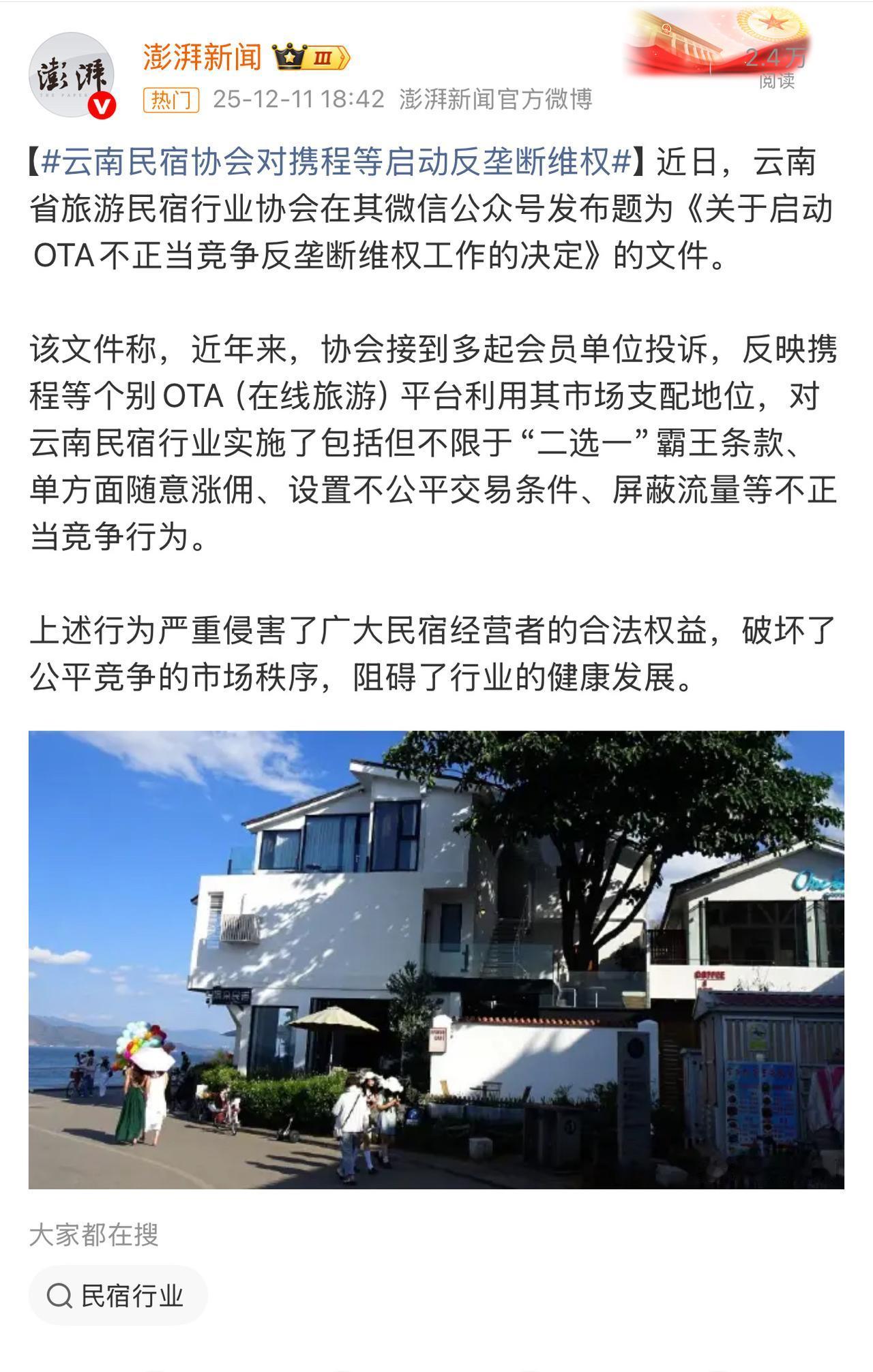 难怪携程这么挣钱呢,一天入账两亿。原来是玩不正当竞争,要求云南这些民宿、酒店“二选一”呢。这种行为真的可耻!