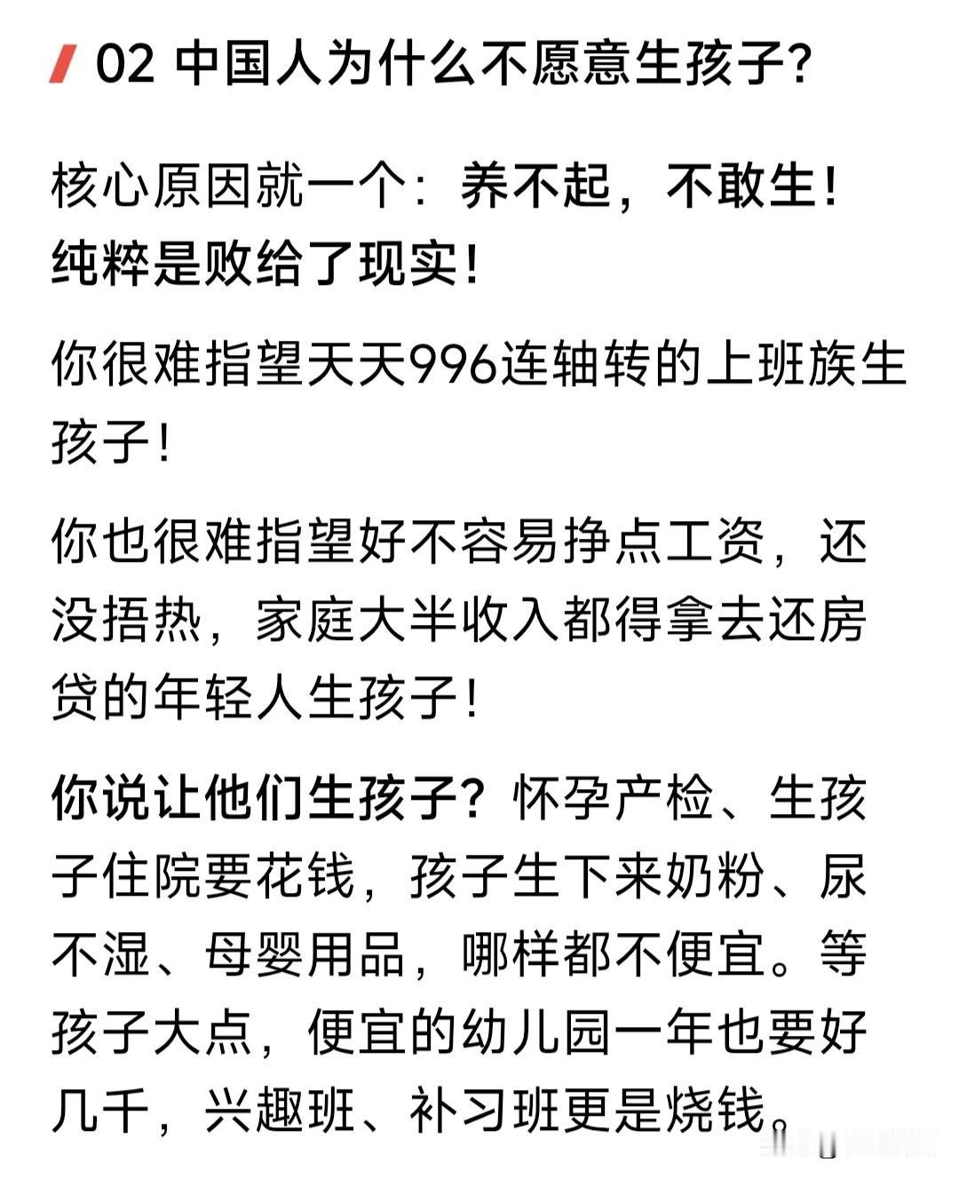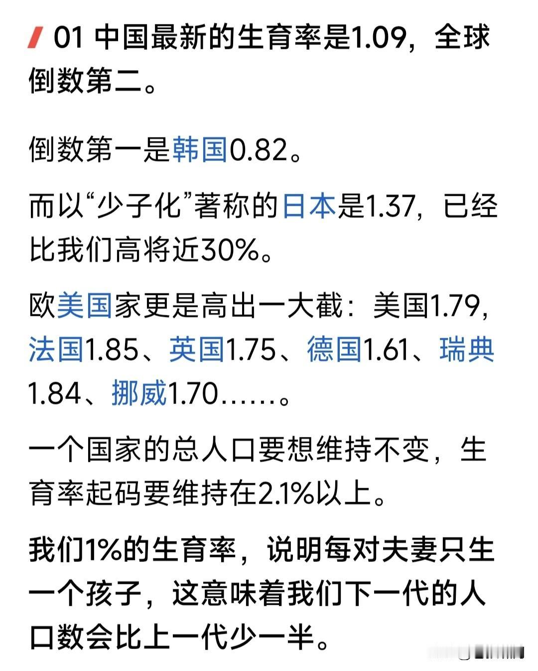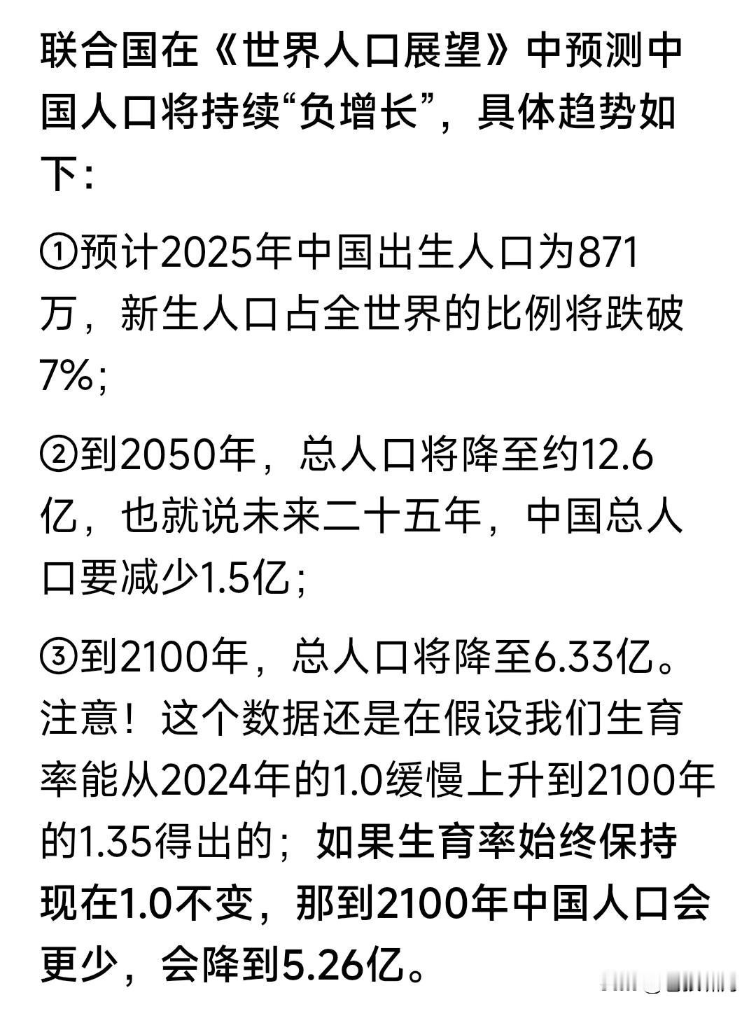 中国出生率亮红灯,联合国给我们发预警!中国人口出生率仅为1.09%,世界倒数第二,仅高于韩国的0.87%。 这个出生率如果不改变,2050年中国人口将由14亿降至12.6亿;2100年将继续减少,降至6.33亿或者5.26亿。 中国人口为何会下降?网友的总结是: 现在养孩子成本高。辛苦挣点钱,要养车还房贷,孕检费出生费教育费,中小城市几十万,北上广深得上百万。 人口出生率下降,会产生什么影响? 医院妇产科由忙到闲,甚至会合并。 由此影响到幼儿园中小学教师队伍。 社会老龄化严重,比例进一步扩大。 未来工作和创造价值的人越来越少。 缴纳社保减少,影响社会养老保障。 如何扭转人口出生率减少现象? 网友给的答案是:优化生育政策,给年轻人生孩子补贴,解决生不起问题;提升年轻人收入,解决养不起问题。 苍狼觉得他说的有道理,但只说对了一半!还有更重要的,就是深化改革,依法治国,保证经济持续发展,增加就业和工资收入,提高社会福利覆盖。 如果做好以上这些,年轻人工作有保证,有房有车有钱挣,还有“生不起孩子”“养不起孩子”的问题吗?我们的人口出生率,自然而然就提高了! …………