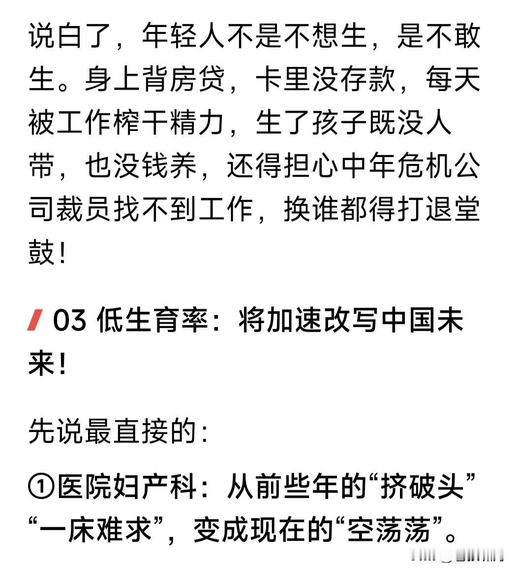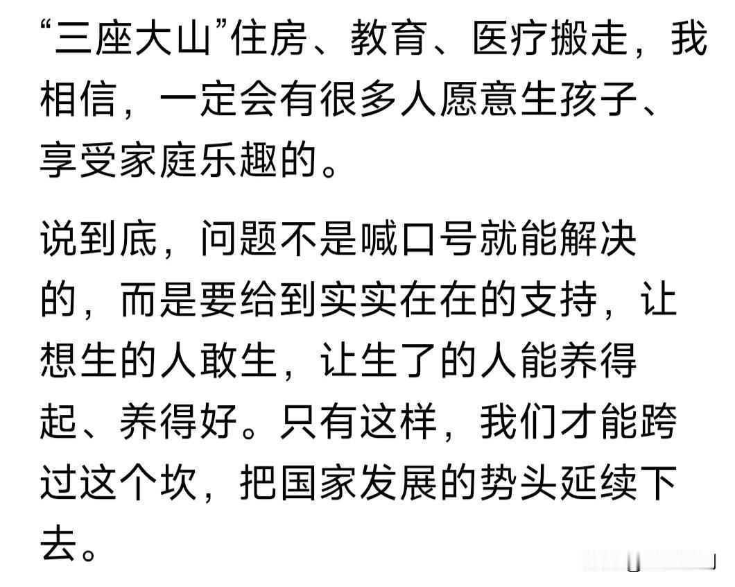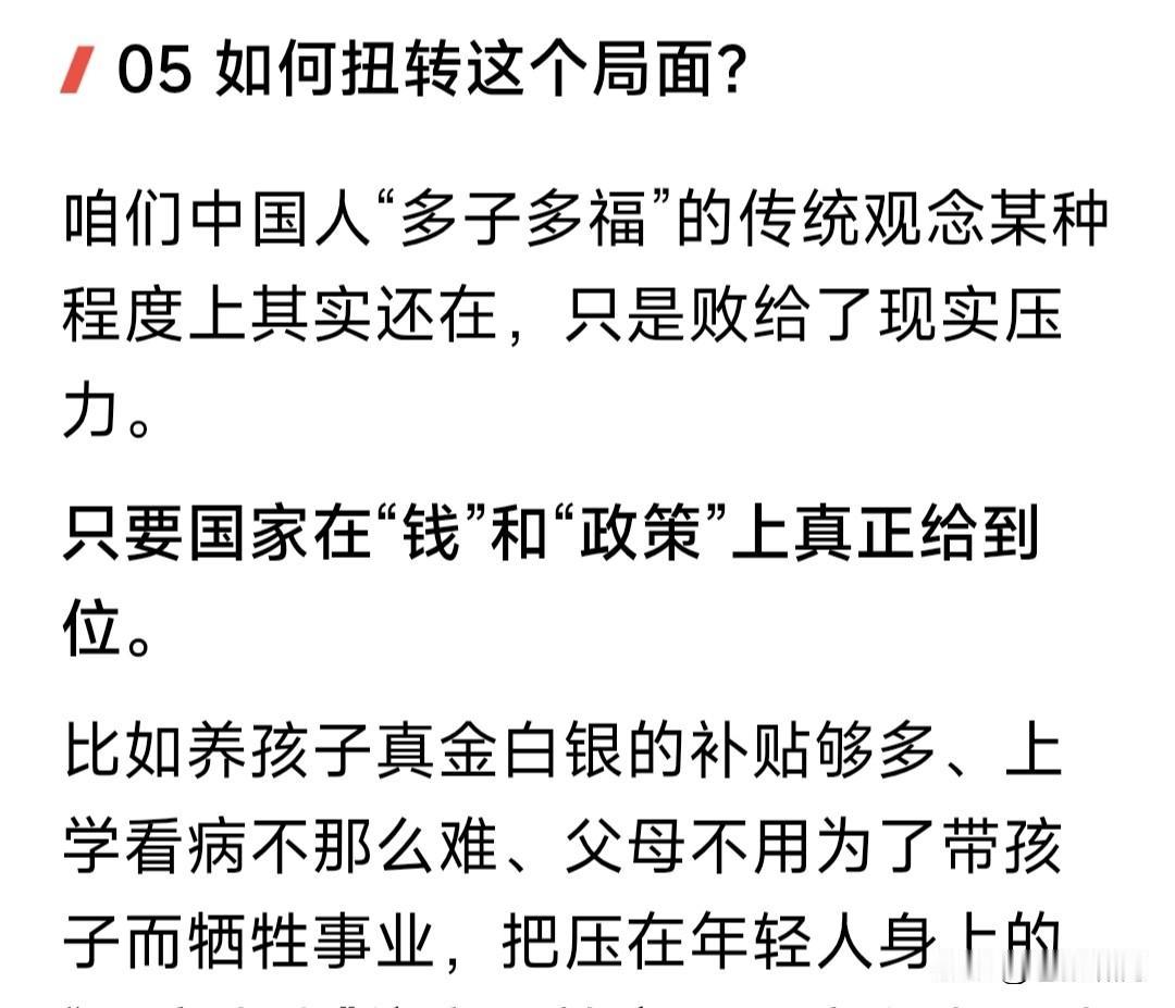 中国出生率亮红灯,联合国给我们发预警!中国人口出生率仅为1.09%,世界倒数第二,仅高于韩国的0.87%。 这个出生率如果不改变,2050年中国人口将由14亿降至12.6亿;2100年将继续减少,降至6.33亿或者5.26亿。 中国人口为何会下降?网友的总结是: 现在养孩子成本高。辛苦挣点钱,要养车还房贷,孕检费出生费教育费,中小城市几十万,北上广深得上百万。 人口出生率下降,会产生什么影响? 医院妇产科由忙到闲,甚至会合并。 由此影响到幼儿园中小学教师队伍。 社会老龄化严重,比例进一步扩大。 未来工作和创造价值的人越来越少。 缴纳社保减少,影响社会养老保障。 如何扭转人口出生率减少现象? 网友给的答案是:优化生育政策,给年轻人生孩子补贴,解决生不起问题;提升年轻人收入,解决养不起问题。 苍狼觉得他说的有道理,但只说对了一半!还有更重要的,就是深化改革,依法治国,保证经济持续发展,增加就业和工资收入,提高社会福利覆盖。 如果做好以上这些,年轻人工作有保证,有房有车有钱挣,还有“生不起孩子”“养不起孩子”的问题吗?我们的人口出生率,自然而然就提高了! …………