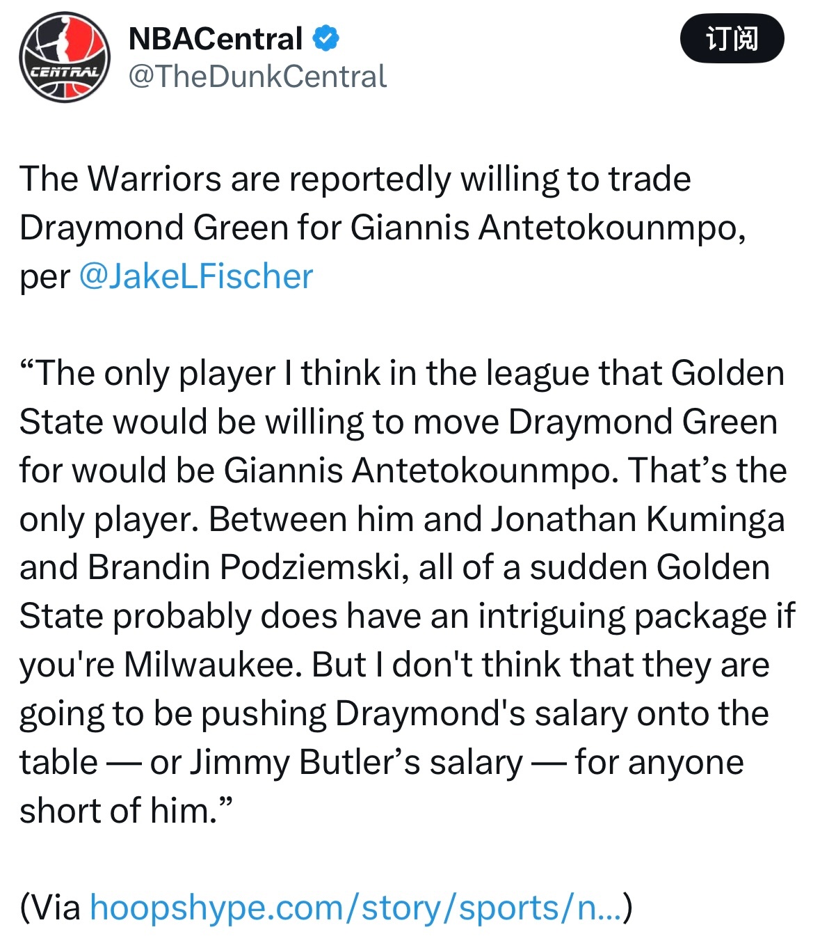 水牛Forover ?Jake Fischer表示,勇士愿意用格林交易字母哥。“我认为全联盟中,勇士队唯一愿意为其送出格林的球员就是字母哥,没有其他人选。如果把格林、库明加和波杰姆斯基打包,对雄鹿队来说,勇士队这套报价组合或许突然就变得很有吸引力了。但我不认为,除非目标是字母哥,否则他们会把格林的合同——或是巴特勒的合同摆上谈判桌。”