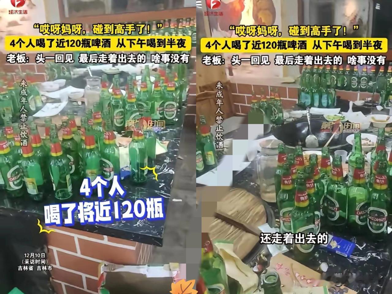 “强得可怕!”吉林,4名男子在饭店聚餐时,一共要了12箱啤酒,平均每人喝了30瓶,结果喝完后各个都跟没事人一样,悠闲的走出了饭店! 喝完不扶墙徒手走出门的操作,直接让饭店老板看傻眼!这哪是喝酒,简直是把啤酒当白开水炫啊! 别光顾着惊叹东北人的酒量,这事儿真不是“天赋异禀”那么简单! 东北冬天天寒地冻,喝酒御寒的习惯刻在骨子里,再加上酒桌上边唠嗑边慢饮的节奏,从下午五点坐到半夜十二点,身体早有时间慢慢代谢! 但说句实在的,这种“拼酒量”的操作真的不提倡!过量饮酒伤肝伤胃,再能喝也架不住健康被透支,现在不少东北年轻人都开始养生,啤酒早就换成枸杞水了! 你身边有没有这种“千杯不醉”的喝酒大神?