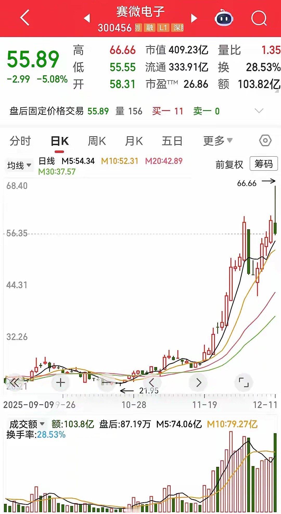 跳水比赛开始了赛微电子,盘中最高涨13个多点,收盘下跌五个多点,全天振幅18个多点该股日线走势非常的漂亮,股价就在五日线上大阳小阳不间断的拉升,之前已经有四连阳了,都以为今天会再创新高构筑五连阳。谁知天有不测风云,尾盘继续杀跌该股成交量创出近期的天量,达到惊人的一百零四亿,伴随着K线冲高回落大阴线的走势,短期顶部特征非常的明显涨多了,该回调了, 散户们这类股票要暂时回避一下