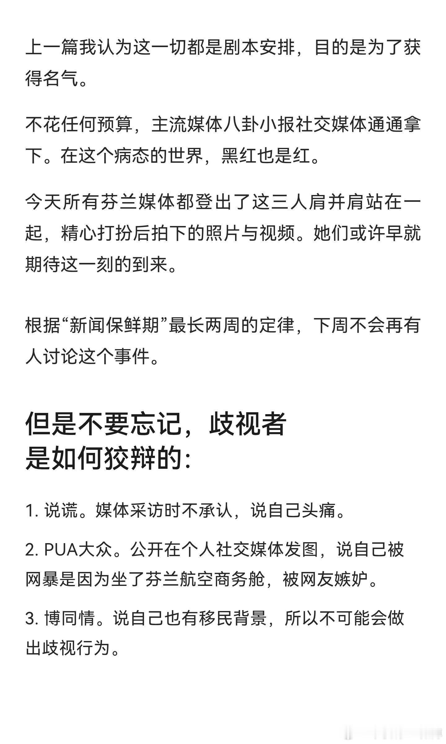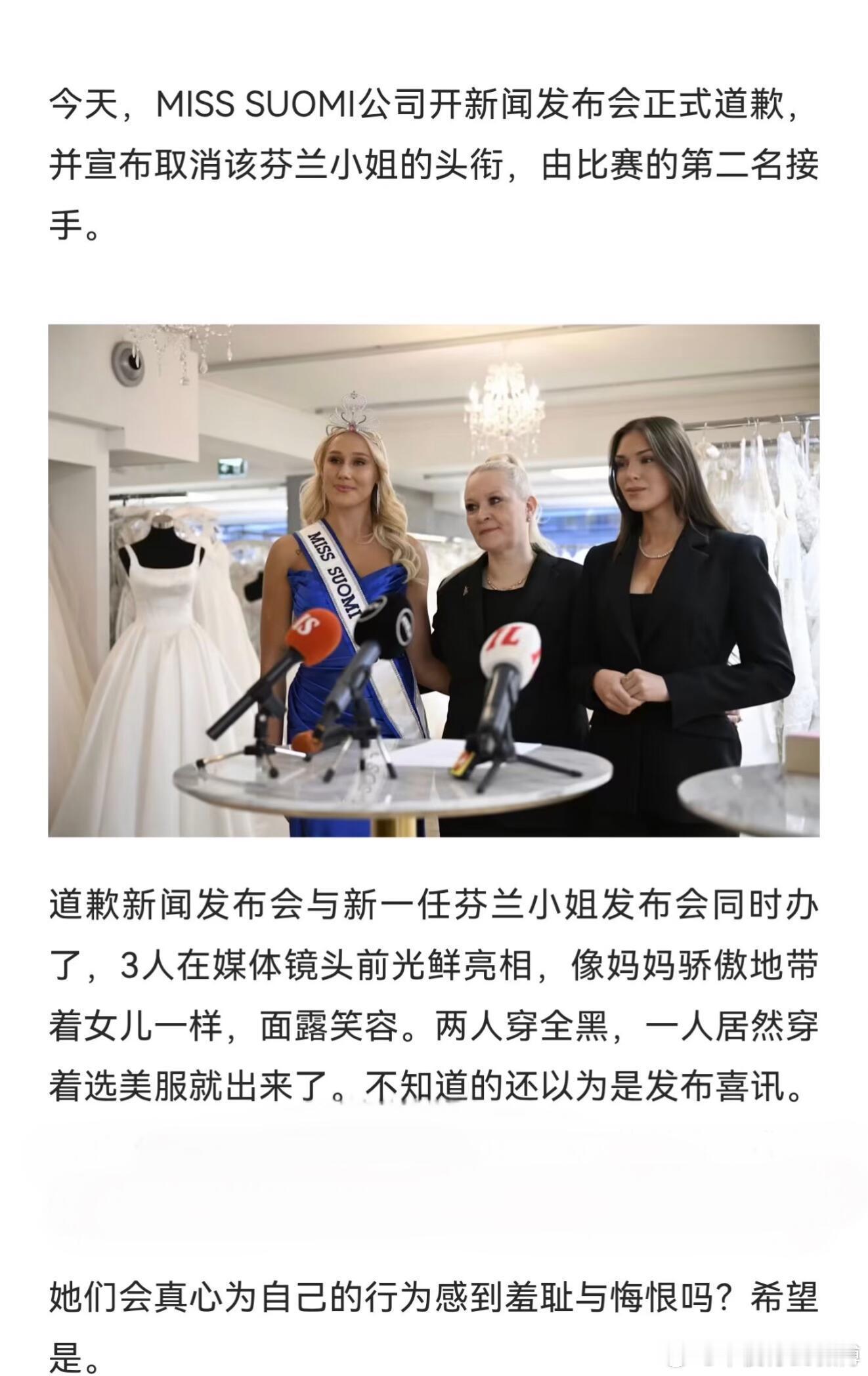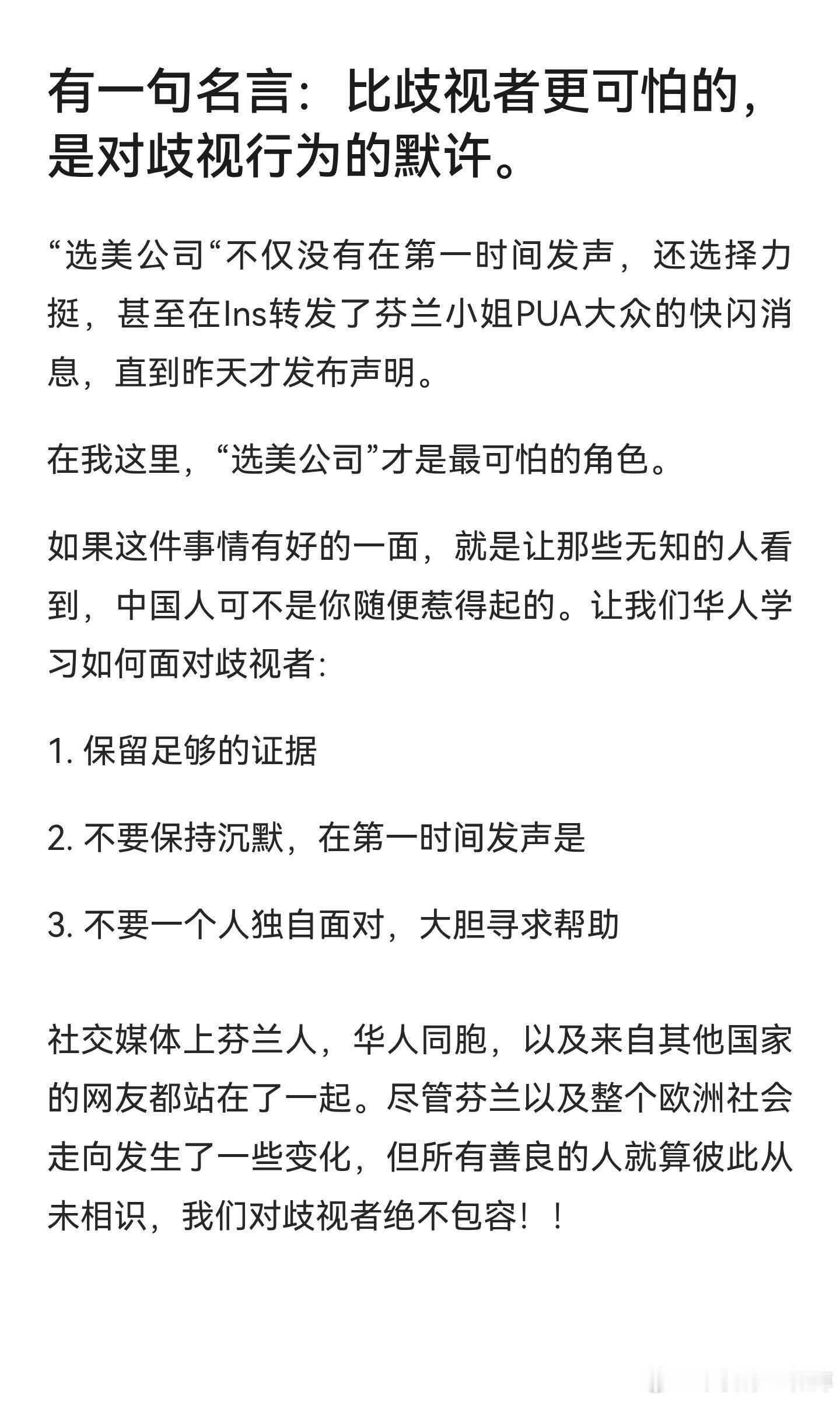 因为歧视中国人,芬兰环球小姐头衔被正式取消。芬兰小姐因歧视行为被取消头衔,选美公司道歉并推新人。事件引发舆论关注,华人网友团结一致,呼吁保留证据、发声和寻求帮助,共同对抗歧视。热点观点华俊竹有话说