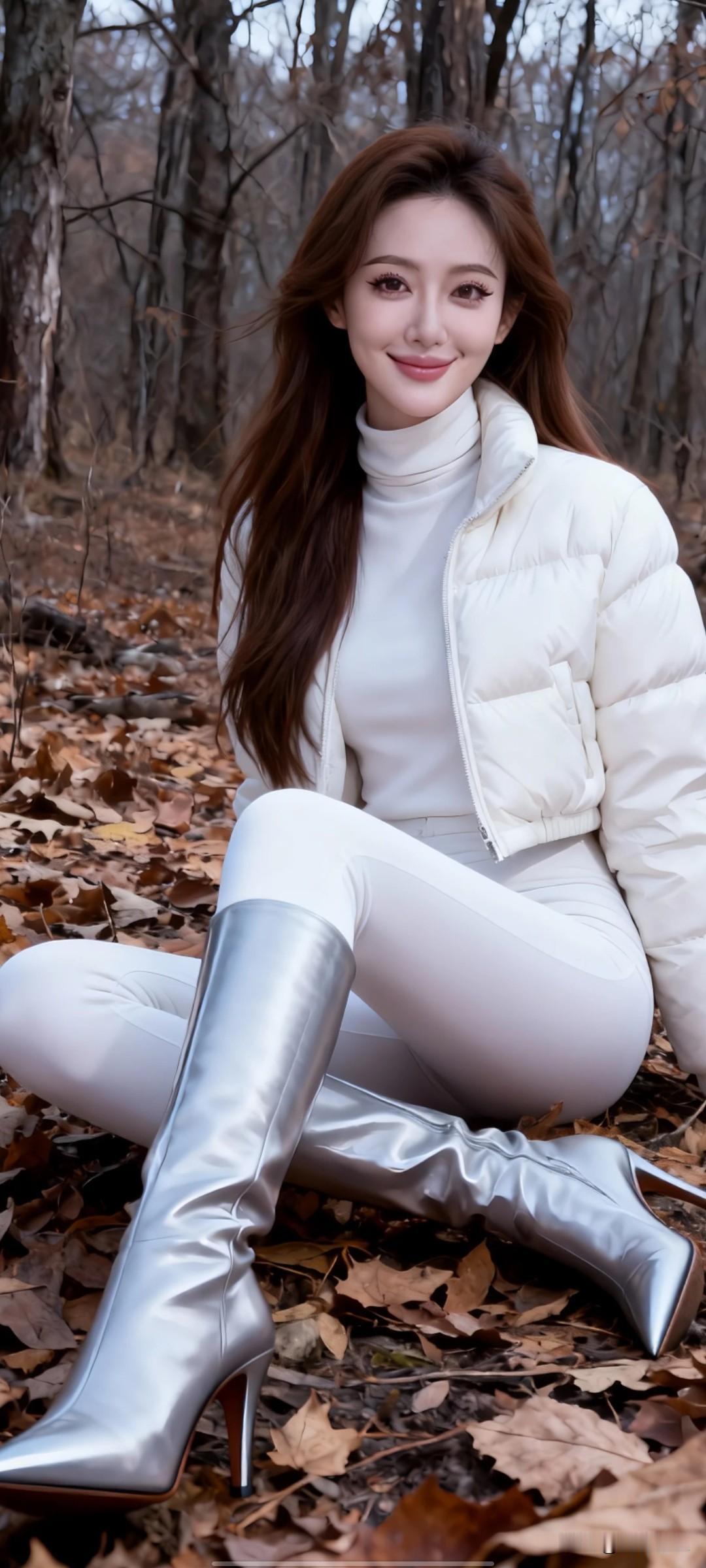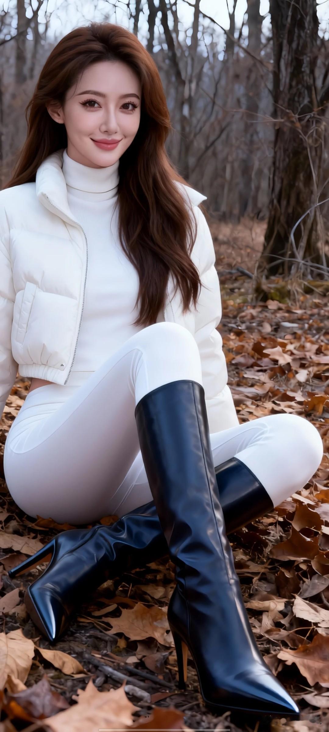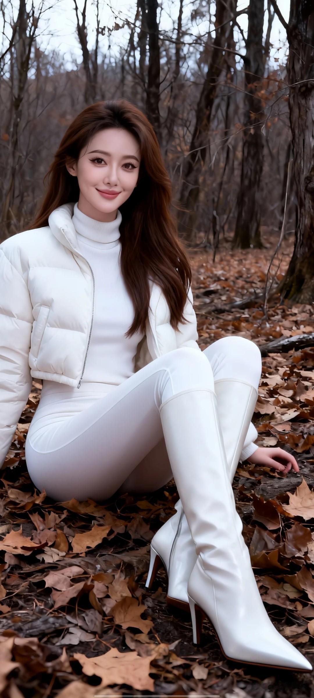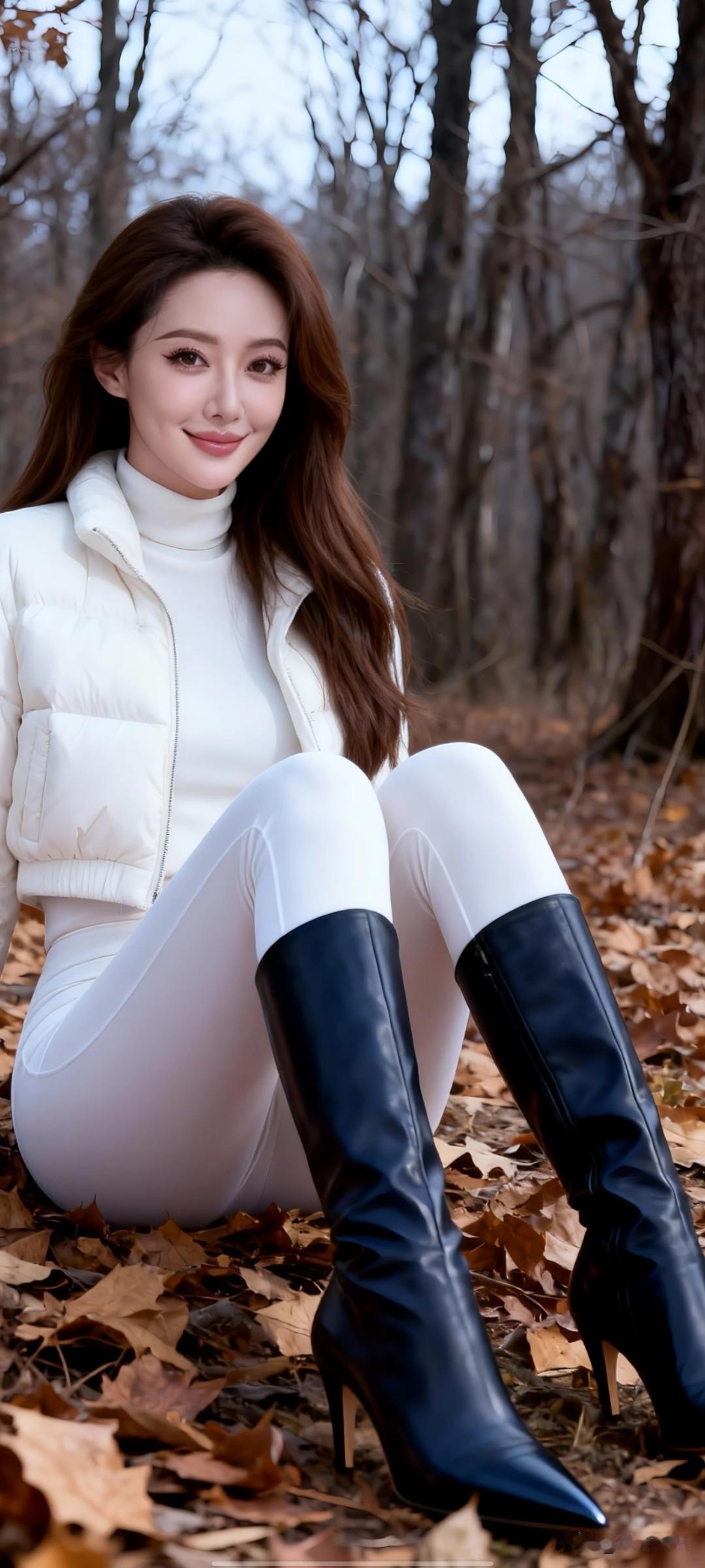 秋日森林中的时尚女孩,白色套装与黑色长靴的完美搭配,尽显优雅与自信。🍂👠💃